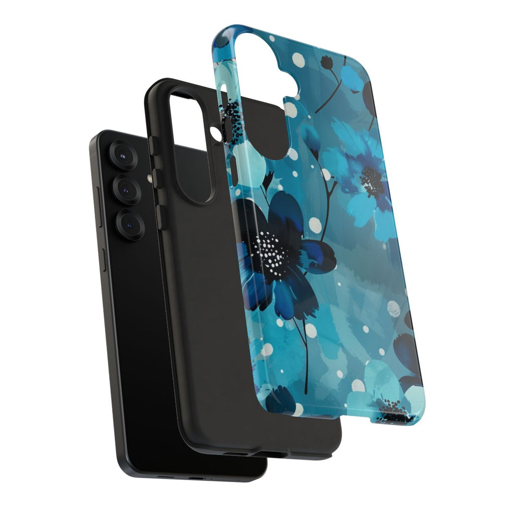 Dit hoesje heeft een levendig bloemenpatroon met grote, geschilderde bloemen in verschillende blauwtinten, van licht turquoise tot diep marineblauw. Witte bladeren en kleine stippen zijn speels over het ontwerp verdeeld en zorgen voor een fraai contrast. De achtergrond bestaat uit diverse blauwnuances met subtiele penseelstreken voor extra diepte. Het glanzende, stevige hoesje is gemaakt van een polycarbonaat buitenkant en een TPU-binnenzijde, waardoor je telefoon goed beschermd is en draadloos opladen mogelijk blijft.