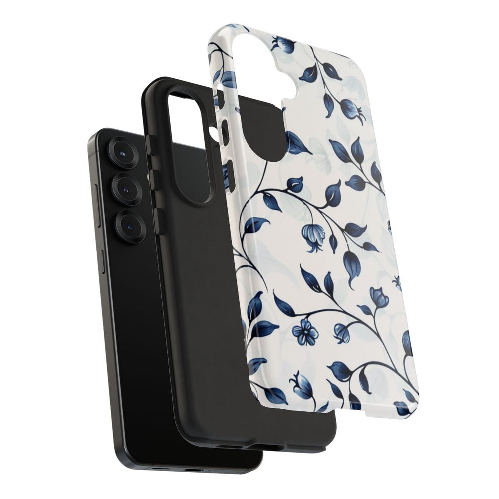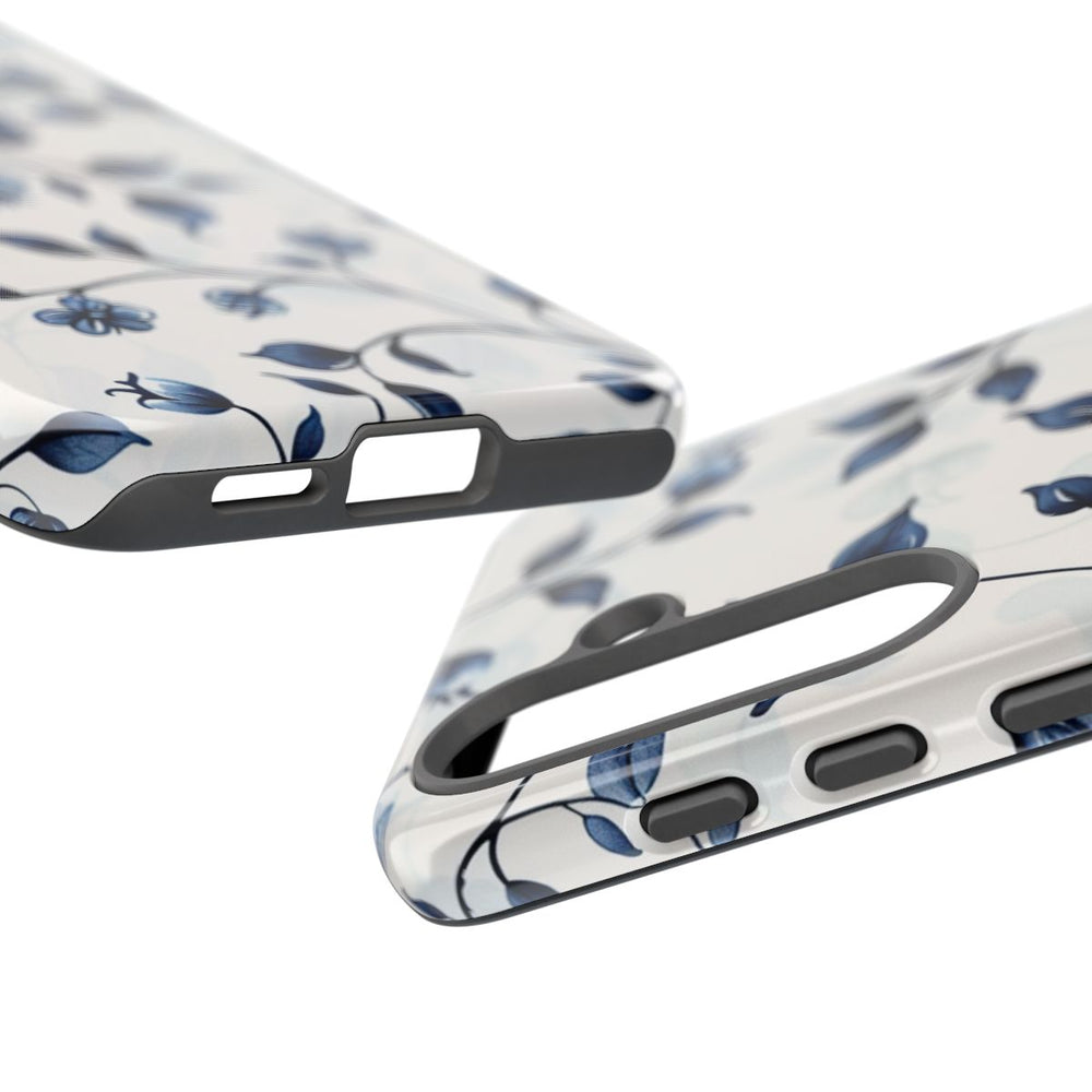 Dit hoesje is voorzien van een naadloos patroon met sierlijke blauwe ranken, kleine bloemen en bladeren op een witte achtergrond. De bloemmotieven zijn gestileerd met vloeiende kleurverlopen, wat zorgt voor een zachte en elegante uitstraling. Het patroon bedekt het gehele oppervlak, waardoor het hoesje bijzonder geschikt is voor een glanzende, stevige afwerking. Het hoesje heeft een dubbele laag: een harde polycarbonaat buitenkant en een TPU binnenzijde voor extra bescherming en duurzaamheid. Geschikt voor draadloos opladen. Niet compatibel met MagSafe.