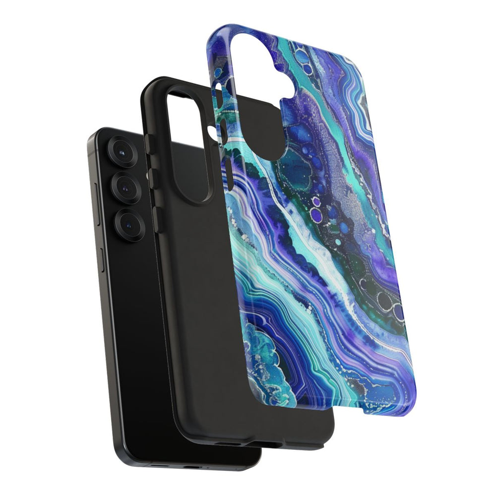 Dit telefoonhoesje heeft een abstract patroon dat is geïnspireerd op geodes, met golvende lagen in blauw-, paars- en groentinten. De lijnen en cirkelvormen doen denken aan natuurlijke steenvormen en zorgen voor een levendig en vloeiend effect. Het hoesje is glanzend en extra stevig dankzij een buitenkant van 100% polycarbonaat en een binnenkant van 100% TPU. Deze dubbele laag biedt optimale bescherming. Het hoesje ondersteunt draadloos opladen en is bestand tegen weersinvloeden, waardoor het zijn uitstraling langdurig behoudt.