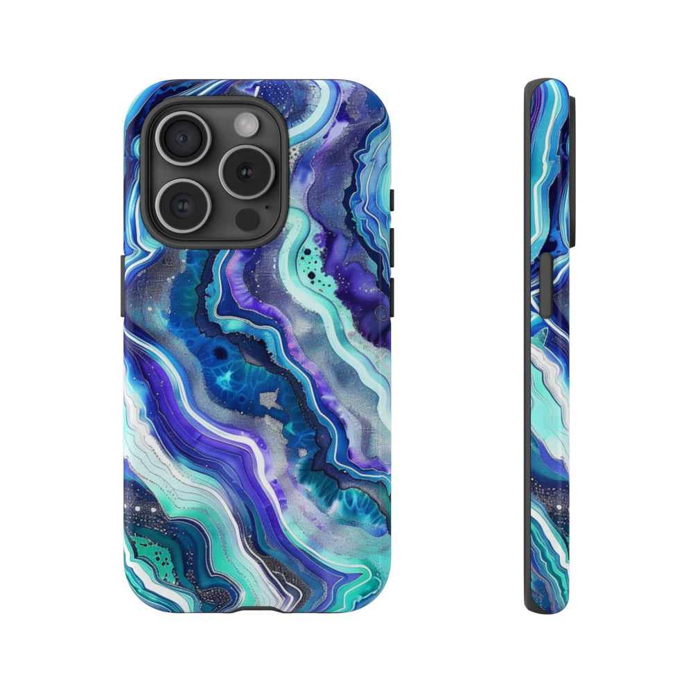 Dit hoesje heeft een abstract geodepatroon met golvende lagen in blauw, turquoise, paars en wit. De afbeelding toont fijne, golvende lijnen die doen denken aan natuurlijke steenstructuren, met een afwisseling van lichte en donkere tinten. Kleine spikkels en subtiele texturen geven het ontwerp extra diepte. Het hoesje heeft een glanzende afwerking, is stevig en bestaat uit een polycarbonaat buitenkant met een TPU binnenzijde voor dubbele bescherming. Ondersteunt draadloos opladen. De glans benadrukt de levendige kleuren en het gedetailleerde patroon.
