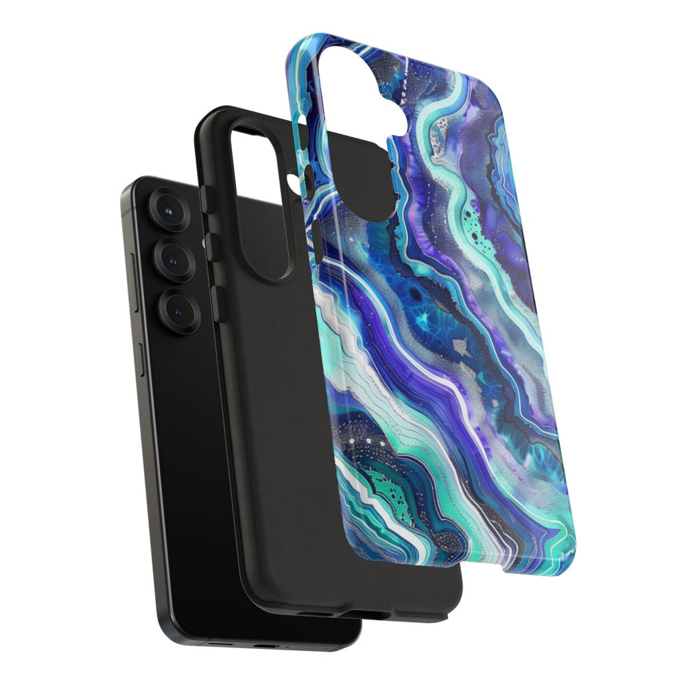 Dit hoesje heeft een abstract geodepatroon met golvende lagen in blauw, turquoise, paars en wit. De afbeelding toont fijne, golvende lijnen die doen denken aan natuurlijke steenstructuren, met een afwisseling van lichte en donkere tinten. Kleine spikkels en subtiele texturen geven het ontwerp extra diepte. Het hoesje heeft een glanzende afwerking, is stevig en bestaat uit een polycarbonaat buitenkant met een TPU binnenzijde voor dubbele bescherming. Ondersteunt draadloos opladen. De glans benadrukt de levendige kleuren en het gedetailleerde patroon.