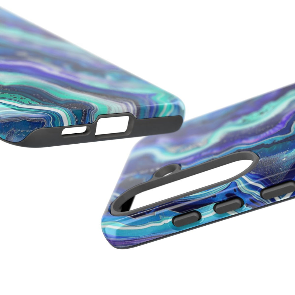 Dit hoesje heeft een abstract geodepatroon met golvende lagen in blauw, turquoise, paars en wit. De afbeelding toont fijne, golvende lijnen die doen denken aan natuurlijke steenstructuren, met een afwisseling van lichte en donkere tinten. Kleine spikkels en subtiele texturen geven het ontwerp extra diepte. Het hoesje heeft een glanzende afwerking, is stevig en bestaat uit een polycarbonaat buitenkant met een TPU binnenzijde voor dubbele bescherming. Ondersteunt draadloos opladen. De glans benadrukt de levendige kleuren en het gedetailleerde patroon.