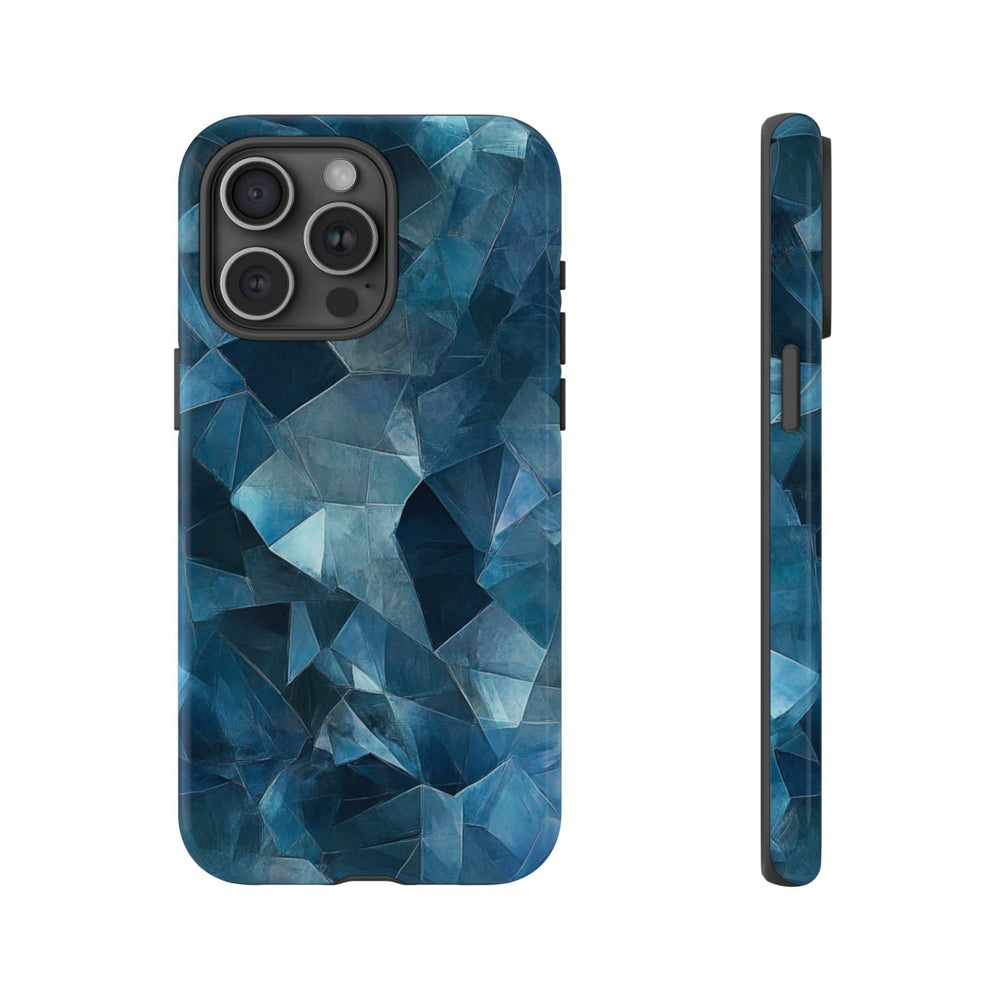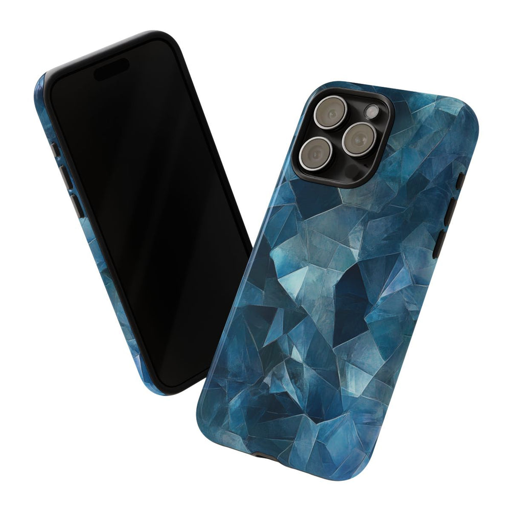 Dit hoesje heeft een abstract patroon dat doet denken aan gekristalliseerde of gefacetteerde oppervlakken in verschillende blauwtinten. Het ontwerp toont overlappende geometrische vormen met scherpe randen en een textuurrijke uitstraling, wat zorgt voor diepte en complexiteit. Het glanzende, stevige hoesje bestaat uit een dubbele laag met een polycarbonaat buitenkant en een TPU-binnenzijde voor extra stevigheid en bescherming. Geschikt voor draadloos opladen en uitstekend bestand tegen weersinvloeden.