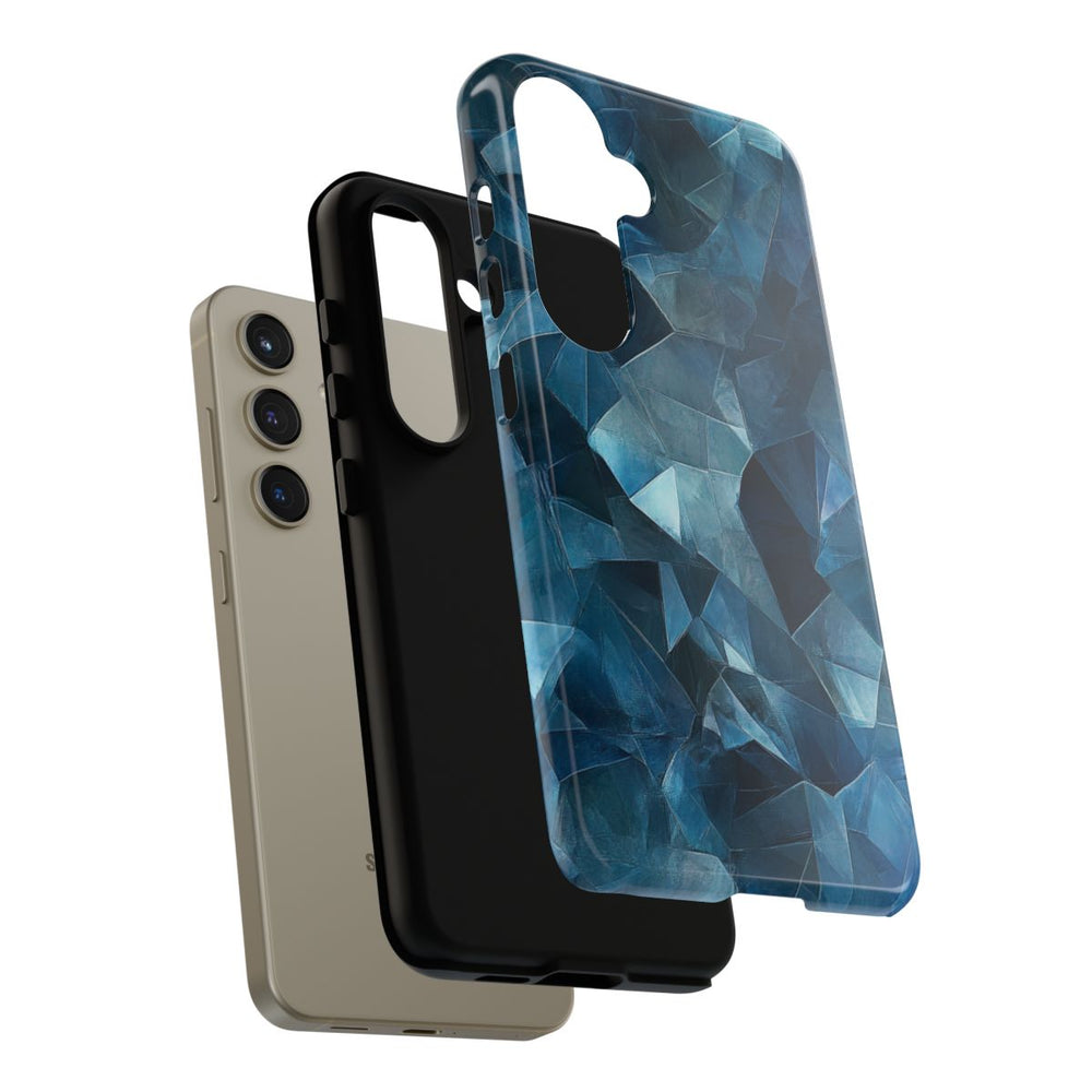 Dit hoesje heeft een abstract patroon dat doet denken aan gekristalliseerde of gefacetteerde oppervlakken in verschillende blauwtinten. Het ontwerp toont overlappende geometrische vormen met scherpe randen en een textuurrijke uitstraling, wat zorgt voor diepte en complexiteit. Het glanzende, stevige hoesje bestaat uit een dubbele laag met een polycarbonaat buitenkant en een TPU-binnenzijde voor extra stevigheid en bescherming. Geschikt voor draadloos opladen en uitstekend bestand tegen weersinvloeden.