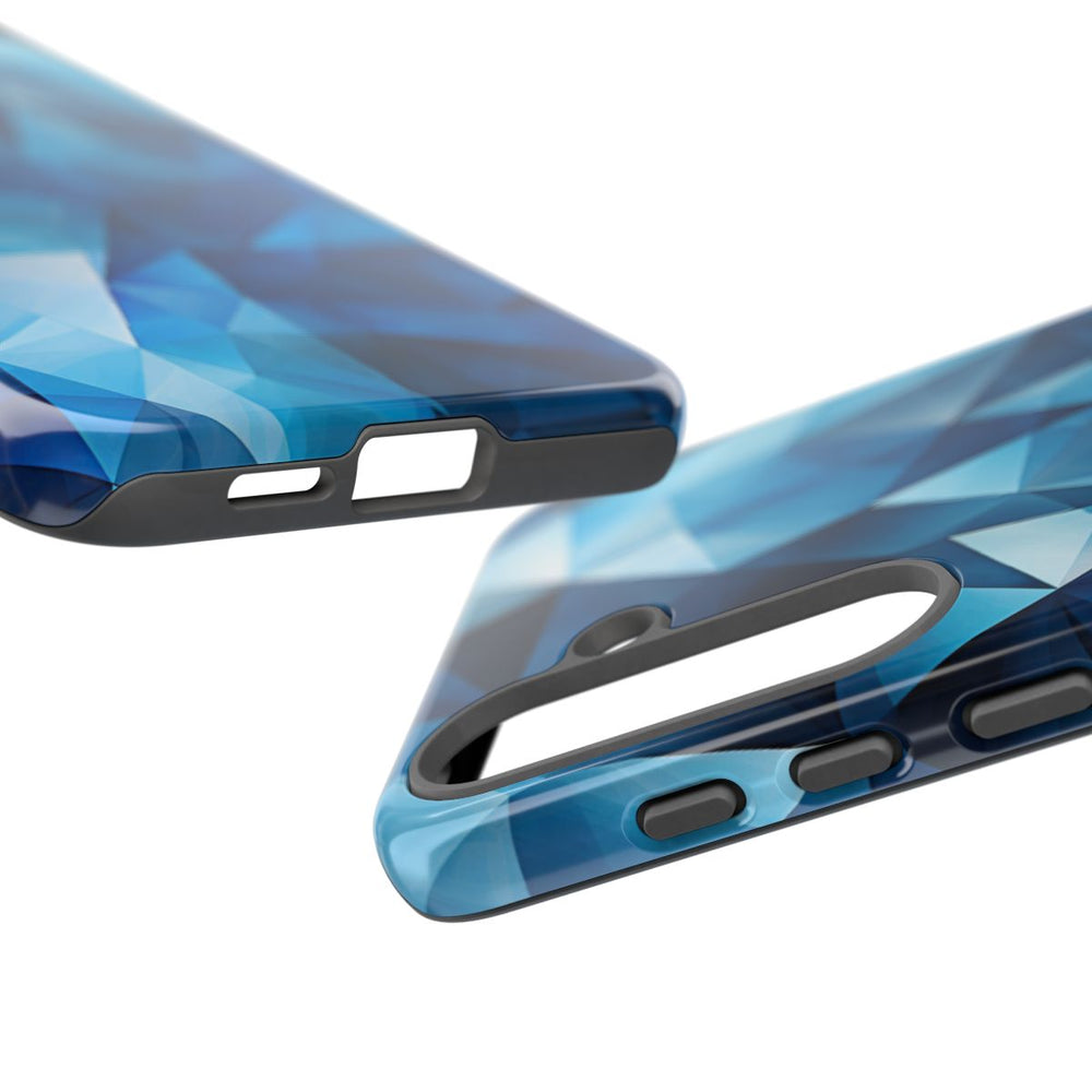 Dit ontwerp heeft een abstract geometrisch patroon van overlappende driehoeken in verschillende tinten blauw. De vormen zorgen voor een gefacetteerd, kristalachtig effect met diepte en dimensie. De kleuren variëren van licht ijzig blauw tot diep marineblauw, wat het patroon een koele en dynamische uitstraling geeft. De afbeelding is bedrukt op een glanzend, stevig hoesje met een polycarbonaat buitenkant en een TPU-binnenzijde. Dit biedt dubbele bescherming en is geschikt voor draadloos opladen.