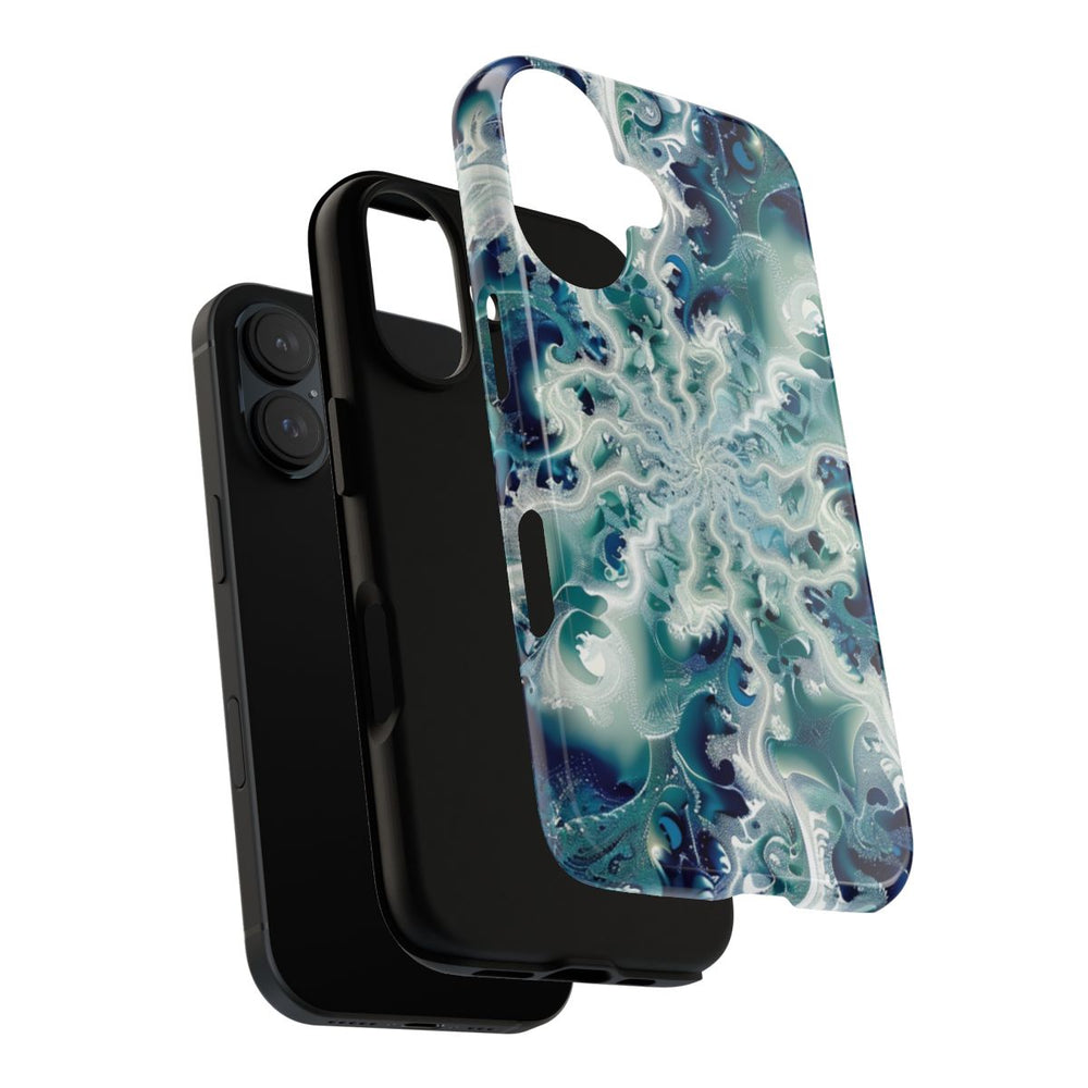 Dit hoesje is bedrukt met een verfijnd fractalpatroon van draaiende vormen en gedetailleerde texturen in tinten blauw, groen en wit. Het abstracte ontwerp zorgt voor een dynamisch en vloeiend visueel effect, waarbij fijne stippen en gebogen lijnen extra diepte en complexiteit geven. Het patroon is aangebracht op een glanzend, stevig hoesje met een dubbele laag van een polycarbonaat buitenkant en een TPU binnenzijde. Deze combinatie biedt extra duurzaamheid en bescherming. Het hoesje ondersteunt draadloos opladen, is bestand tegen weersinvloeden en behoudt langdurig zijn heldere uitstraling.