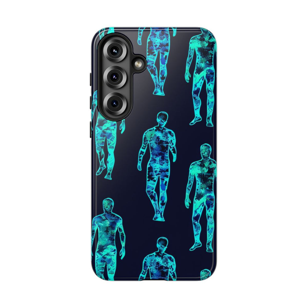 Dit ontwerp toont een herhalend patroon van mensfiguren met blauwe en groene neontinten. De figuren zijn gelijkmatig verdeeld over een donkerblauwe achtergrond, wat zorgt voor een naadloos en doorlopend effect. Elke silhouet heeft opvallende, lichtgevende contouren en verfijnde details, wat het geheel een futuristische en abstracte uitstraling geeft. Het hoesje heeft een glanzende afwerking en bestaat uit een stevige dubbele laag van polycarbonaat en TPU, waardoor het extra duurzaam is en geschikt voor draadloos opladen.