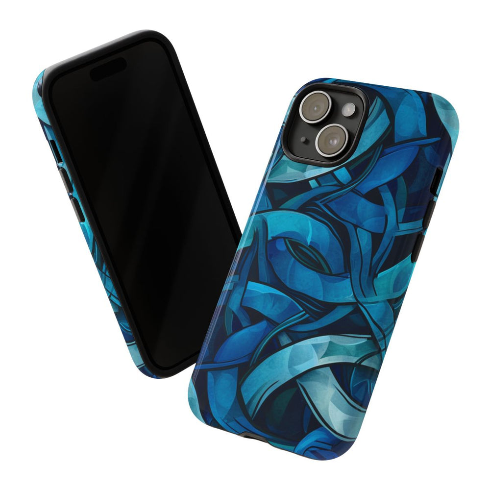 Dit ontwerp toont een verfijnd Keltisch knoopmotief met in elkaar verweven lijnen en lussen in verschillende blauwtinten. Het patroon zorgt voor diepte en beweging door de vloeiende lijnen en subtiele schaduweffecten. De donkere achtergrond laat de heldere blauwe kleuren extra opvallen. De afbeelding is gedrukt op een glanzend en stevig hoesje met een polycarbonaat buitenkant en een TPU-binnenzijde. Dit zorgt voor dubbele bescherming en maakt draadloos opladen mogelijk. Het hoesje is ontworpen voor duurzaamheid en bestand tegen gebruik buitenshuis.