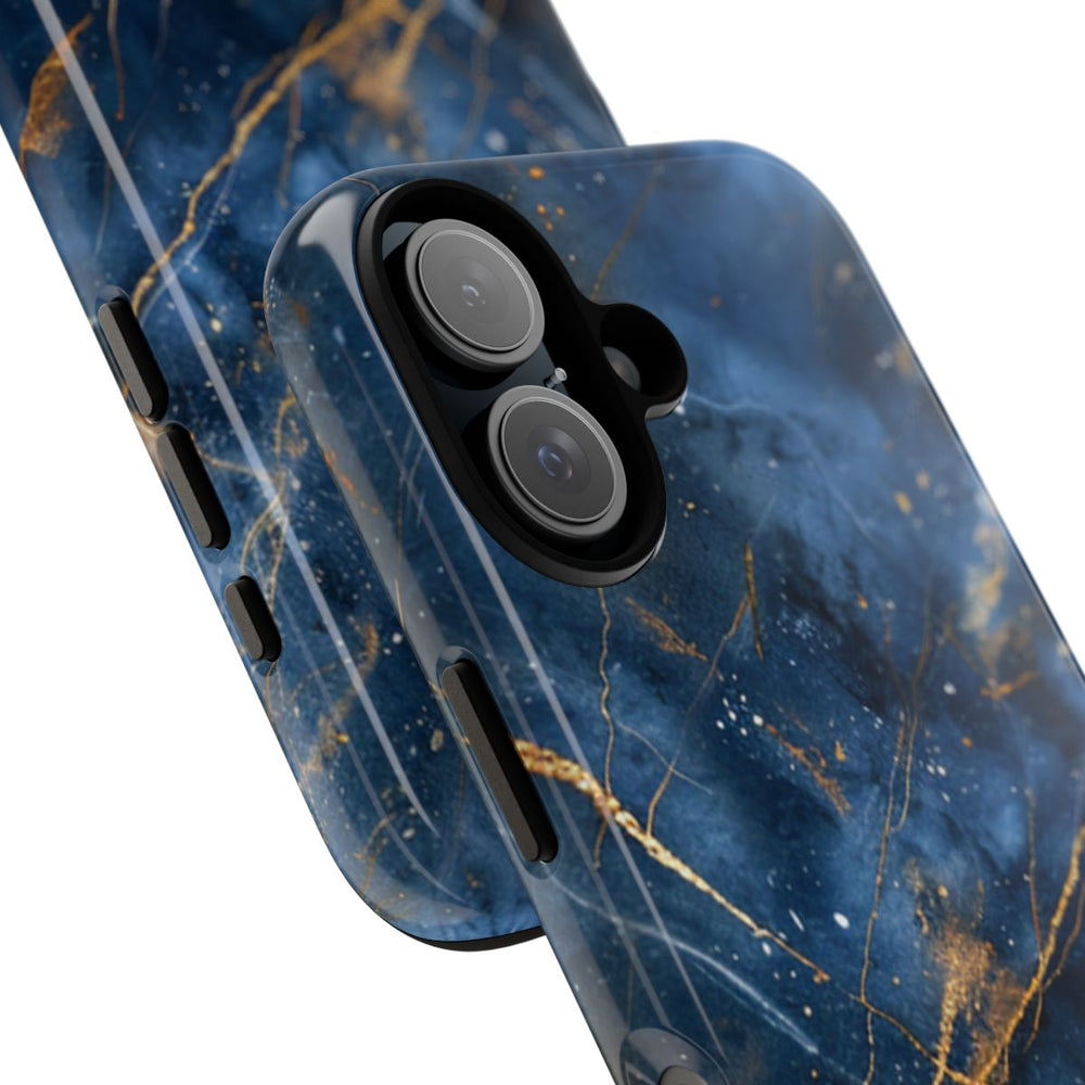Dit hoesje heeft een stijlvol blauw marmerpatroon met verfijnde gouden aders die over het hele ontwerp lopen. De combinatie van diepe en lichtere blauwtinten met subtiele witte accenten zorgt voor een dynamische en elegante uitstraling. De gouden aders geven het geheel een luxe effect en vormen een mooi contrast met de blauwe achtergrond. Het glanzende hoesje is stevig uitgevoerd met een dubbele laag: een harde polycarbonaat buitenkant en een schokabsorberende TPU binnenzijde voor optimale bescherming en duurzaamheid. Geschikt voor draadloos opladen en uitstekend bestand tegen dagelijks gebruik en verschillende weersomstandigheden.
