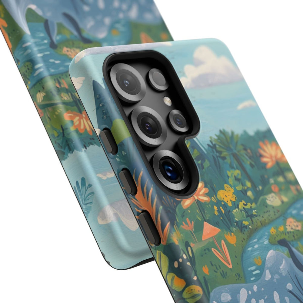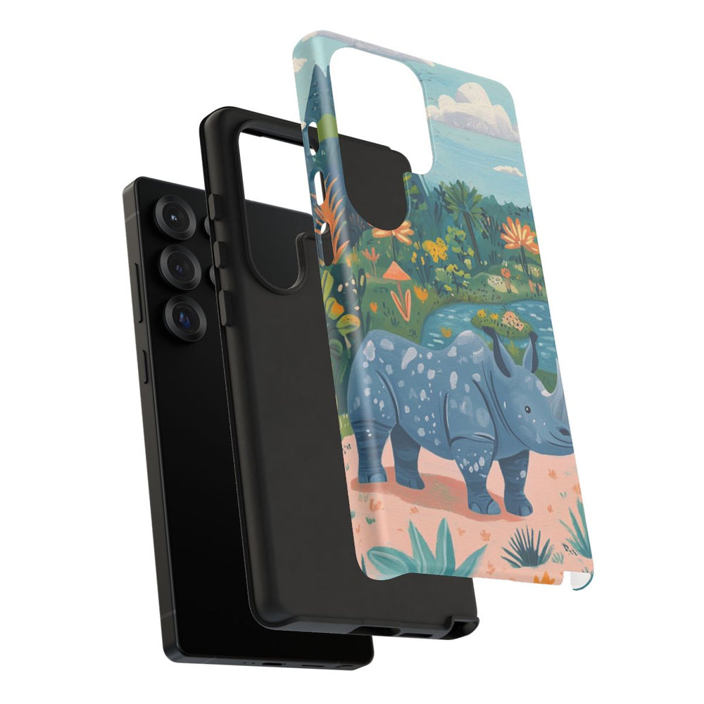 Dit hoesje toont een blauwe neushoorn in een kleurrijke, natuurlijke omgeving met diverse planten en bloemen rond een klein vijvertje. Op de achtergrond zijn bergen en een lucht met zachte wolken te zien. De illustratie is geschilderd in gouache-stijl met een rustige kleurencombinatie en accenten van oranje en geel. Het stevige, dubbelgelaagde hoesje heeft een polycarbonaat buitenkant en een TPU-binnenzijde, en ondersteunt draadloos opladen.