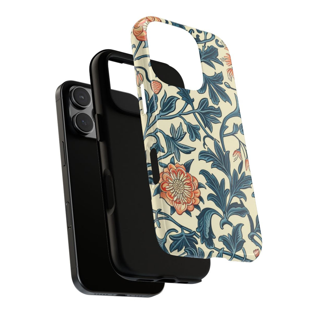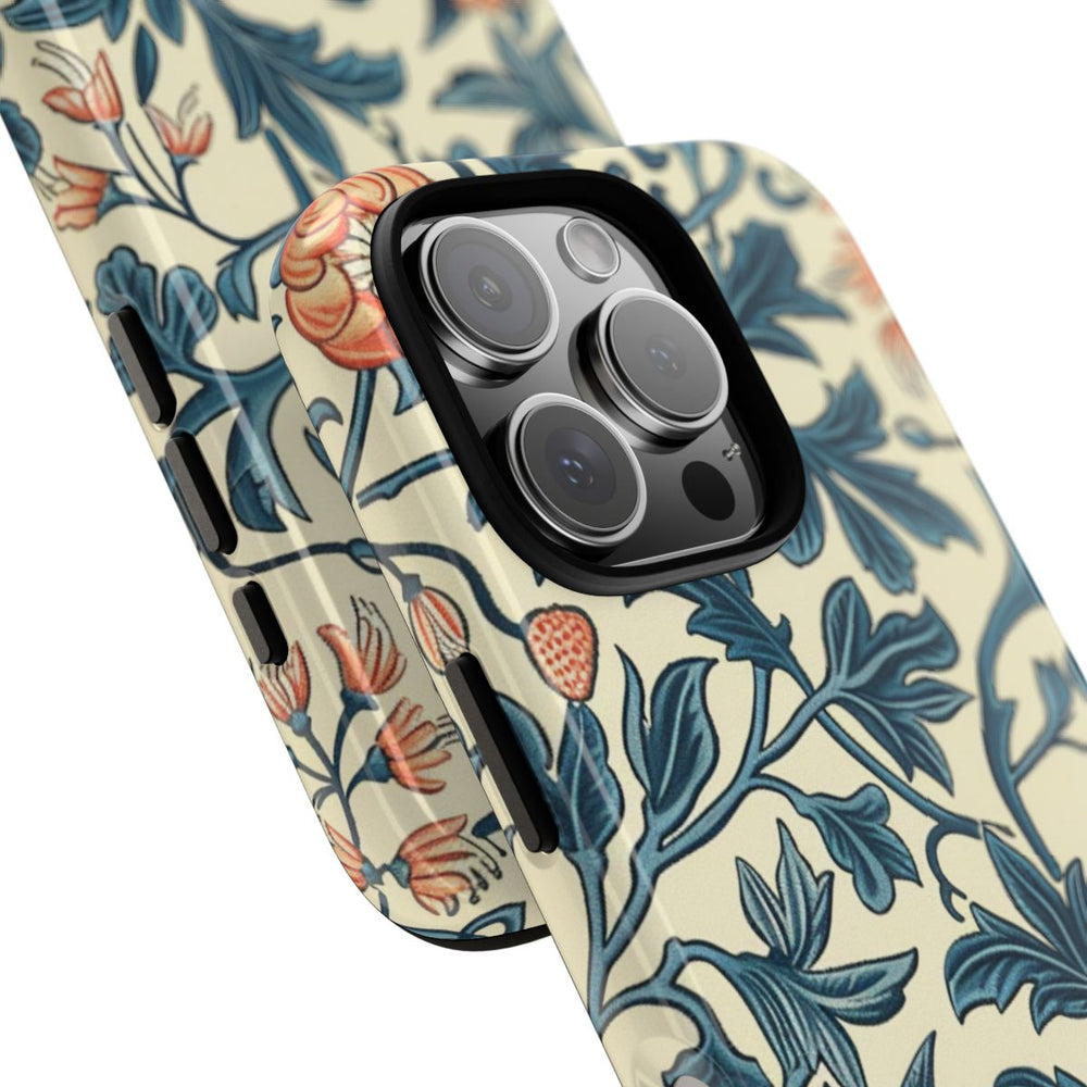 Dit hoesje heeft een verfijnd bloemenpatroon met blauwe bladeren en oranje bloemen op een beige achtergrond. De bloemen verschillen in vorm en grootte en zijn met elkaar verbonden door sierlijke stelen en gedetailleerd bladwerk. Het patroon is dicht en doorlopend, wat zorgt voor een klassieke en elegante uitstraling. Het glanzende, stevige hoesje bestaat uit een dubbele laag met een polycarbonaat buitenkant en een TPU binnenzijde. Dit biedt extra stevigheid en bescherming, terwijl draadloos opladen ondersteund blijft.