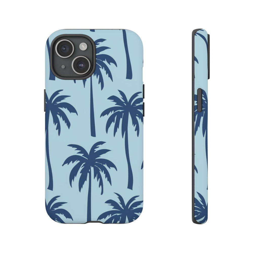 Dit telefoonhoesje heeft een herhalend patroon van eenvoudige, gestileerde palmbomen in een diepblauwe kleur op een lichtblauwe achtergrond. De palmbomen zijn minimalistisch vormgegeven met strakke lijnen en zonder extra details of schaduwen. Het patroon is gelijkmatig verdeeld en zorgt voor een rustige, tropische uitstraling. Het matte hoesje is extra stevig dankzij de dubbele laag van polycarbonaat en TPU, en biedt optimale bescherming. Ondersteunt draadloos opladen.