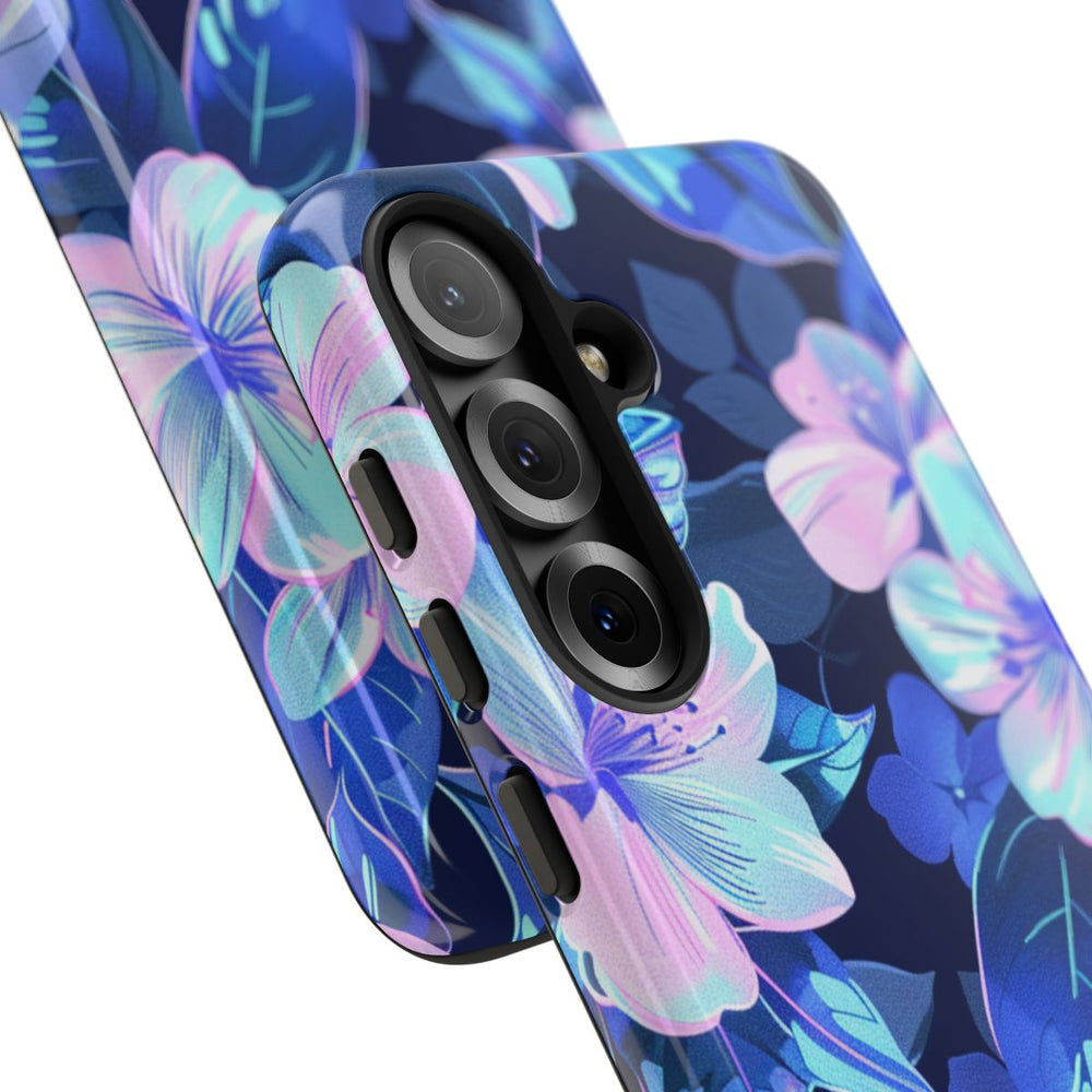 Dit hoesje is voorzien van een herhalend patroon met gestileerde bloemen en bladeren in tinten blauw, lichtpaars en roze. De bloemen hebben zachte kleurverlopen en verfijnde details in de bloemblaadjes, terwijl de bladeren verschillende vormen en nerven tonen. De achtergrond is diep donkerblauw, wat zorgt voor een opvallend contrast met de lichte bloemelementen. Het ontwerp is gedrukt op een glanzend en stevig hoesje met een dubbele laag van polycarbonaat en TPU, voor extra bescherming en ondersteuning van draadloos opladen.
