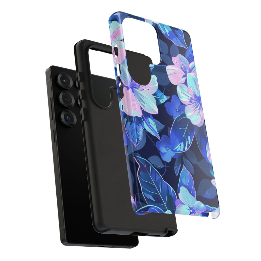 Dit hoesje is voorzien van een herhalend patroon met gestileerde bloemen en bladeren in tinten blauw, lichtpaars en roze. De bloemen hebben zachte kleurverlopen en verfijnde details in de bloemblaadjes, terwijl de bladeren verschillende vormen en nerven tonen. De achtergrond is diep donkerblauw, wat zorgt voor een opvallend contrast met de lichte bloemelementen. Het ontwerp is gedrukt op een glanzend en stevig hoesje met een dubbele laag van polycarbonaat en TPU, voor extra bescherming en ondersteuning van draadloos opladen.