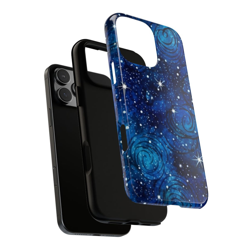Dit telefoonhoesje is voorzien van een diepblauwe achtergrond met talloze witte sterren die verspreid over het ontwerp staan. De sierlijke vormen in verschillende tinten blauw zorgen voor een gevoel van diepte en een kosmische uitstraling. De sterren verschillen in grootte; sommige lichten helder op, terwijl andere als kleine stipjes zichtbaar zijn. De afbeelding is gedrukt op een glanzend en stevig hoesje met een dubbele laag van polycarbonaat en TPU, wat zorgt voor extra stevigheid en bescherming. Bovendien ondersteunt het hoesje draadloos opladen.