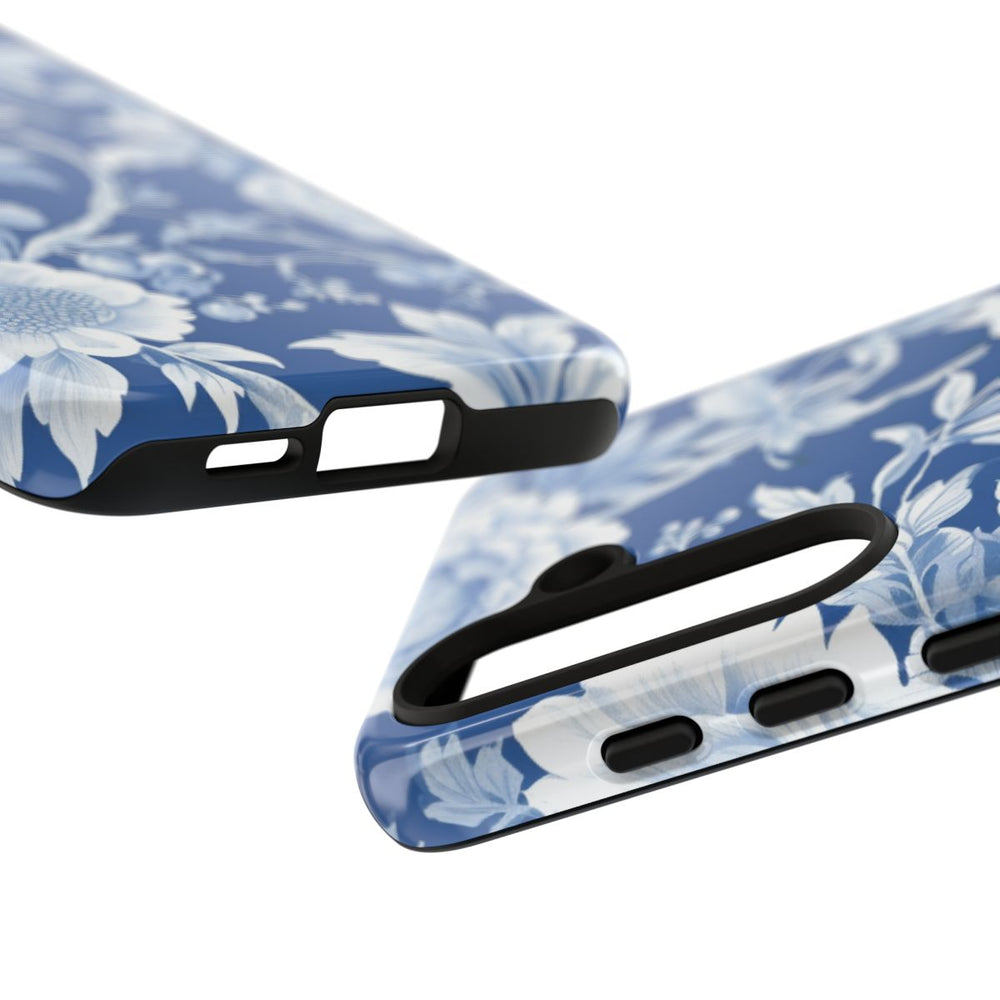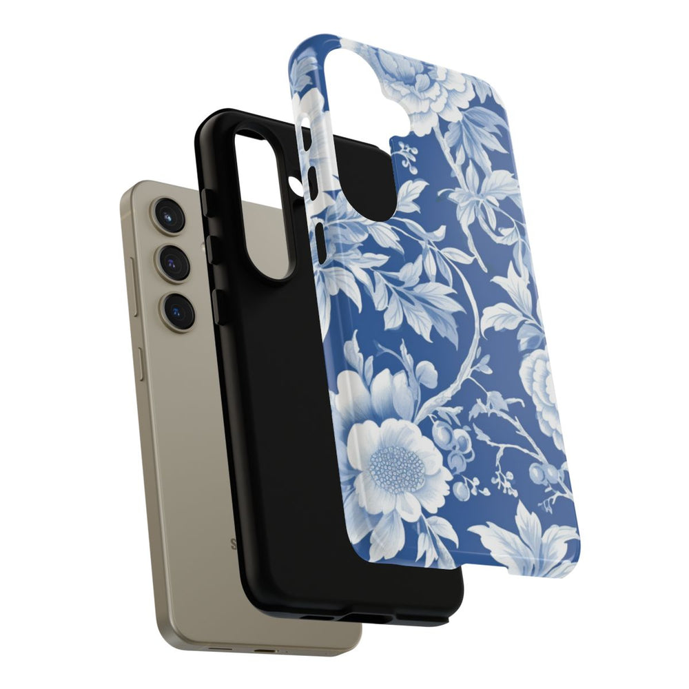 Dit hoesje is voorzien van een naadloos bloemenpatroon met gedetailleerde witte bloemen en bladeren op een diepe blauwe achtergrond. De verfijnde botanische elementen, waaronder verschillende bloesems en bladeren, zorgen voor een klassieke en elegante uitstraling. Het patroon is evenwichtig en symmetrisch, waarbij de fijne schaduwen en texturen in de bloemenillustraties mooi naar voren komen. De afbeelding is gedrukt op een glanzend, stevig hoesje van duurzaam polycarbonaat met een TPU-voering. Dit biedt extra bescherming en ondersteunt draadloos opladen.