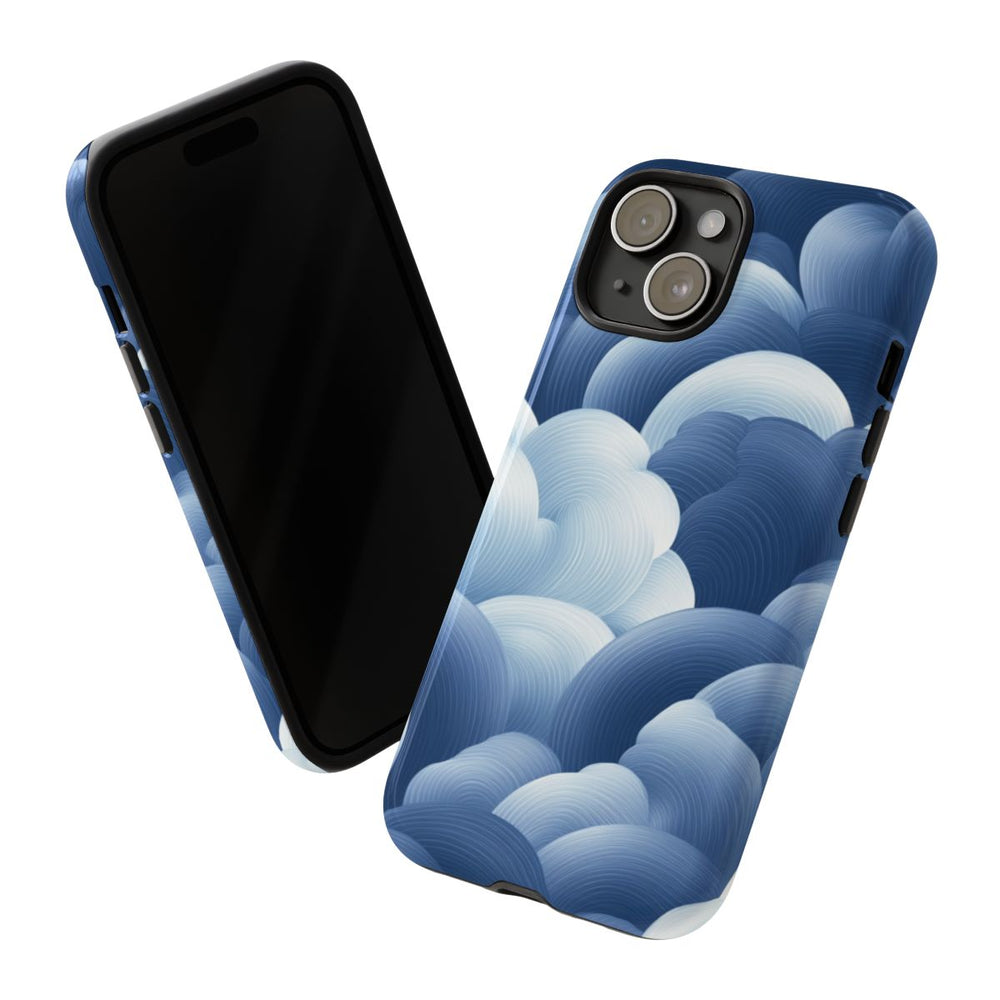 Dit telefoonhoesje is voorzien van een naadloos patroon met gestileerde wolken in verschillende tinten blauw en wit. De wolken zijn afgewerkt met een subtiel, zwierig lijnenspel dat diepte en beweging aan het ontwerp toevoegt. Het geheel oogt zacht en rustgevend, met een nadruk op koele kleuren. Het glanzende, stevige hoesje bestaat uit een dubbele laag: een harde polycarbonaat buitenkant en een TPU-binnenzijde, voor extra stevigheid en bescherming. Geschikt voor draadloos opladen en uitstekend bestand tegen invloeden van buitenaf.