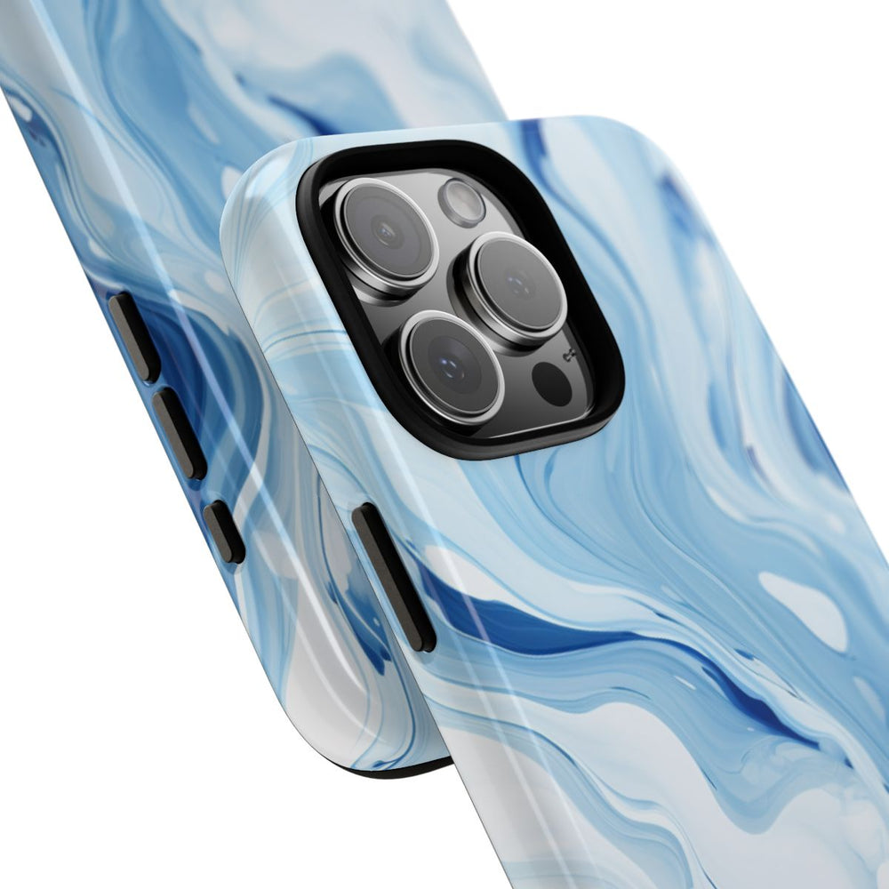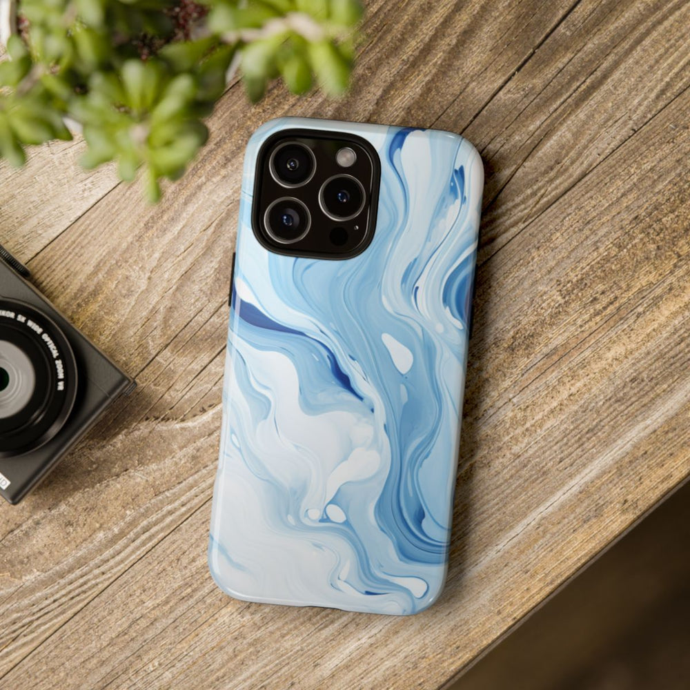 Dit hoesje is voorzien van een sierlijk marmerpatroon in verschillende tinten blauw en wit. De abstracte, vloeiende vormen lopen naadloos in elkaar over en zorgen voor een dynamisch en rustgevend effect. Het hoesje heeft een glanzende afwerking en bestaat uit een stevige polycarbonaat buitenkant met een TPU-binnenlaag voor extra bescherming. Het hoesje ondersteunt draadloos opladen en is bestand tegen invloeden van buitenaf, zodat het ontwerp langdurig mooi blijft. De koele kleuren en organische beweging maken dit hoesje tot een stijlvolle en functionele keuze.
