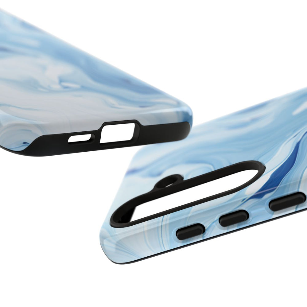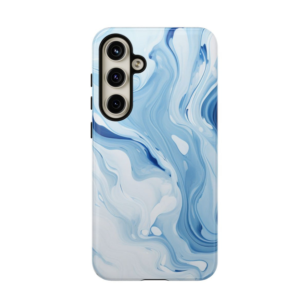 Dit hoesje is voorzien van een sierlijk marmerpatroon in verschillende tinten blauw en wit. De abstracte, vloeiende vormen lopen naadloos in elkaar over en zorgen voor een dynamisch en rustgevend effect. Het hoesje heeft een glanzende afwerking en bestaat uit een stevige polycarbonaat buitenkant met een TPU-binnenlaag voor extra bescherming. Het hoesje ondersteunt draadloos opladen en is bestand tegen invloeden van buitenaf, zodat het ontwerp langdurig mooi blijft. De koele kleuren en organische beweging maken dit hoesje tot een stijlvolle en functionele keuze.