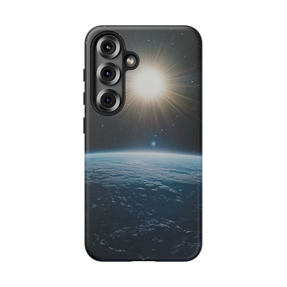 Dit ontwerp toont het uitzicht op de horizon van een blauwe planeet vanuit de ruimte, verlicht door een felle zon recht vooruit. Op de donkere achtergrond zijn talloze kleine, fonkelende sterren zichtbaar. Het oppervlak van de planeet oogt getextureerd met subtiele lichtreflecties. De afbeelding is gedrukt op een mat, stevig telefoonhoesje met dubbele laag van polycarbonaat en TPU. Het hoesje biedt extra bescherming en is geschikt voor draadloos opladen.
