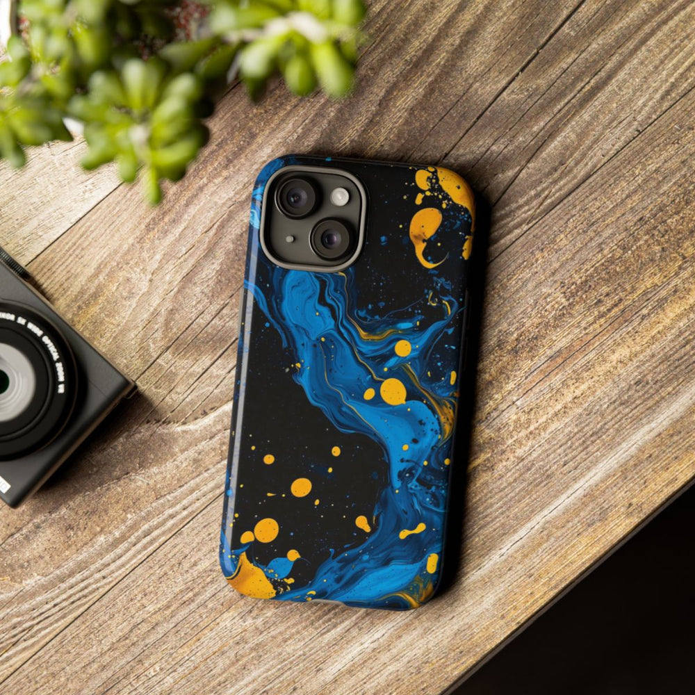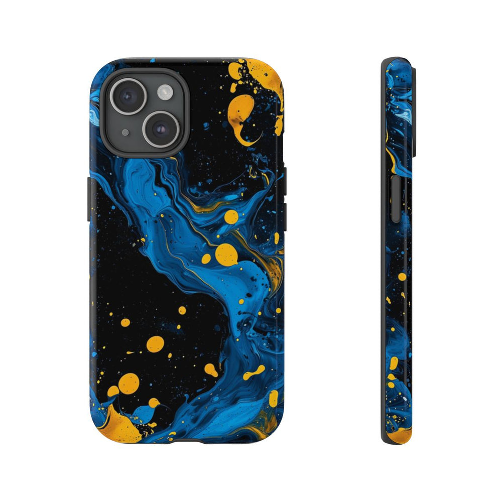 Dit ontwerp heeft opvallende blauwe en gele verfspatten en -wervelingen op een diepzwarte achtergrond. De blauwe verf vormt vloeiende, golvende patronen met verschillende tinten en structuren, terwijl de gele verf te zien is als krachtige, verspreide druppels en spetters. Het kleurcontrast zorgt voor een dynamische en energieke abstracte uitstraling. Dit glanzende, stevige hoesje is gemaakt van een polycarbonaat buitenkant met een TPU-binnenzijde en biedt dubbele bescherming. Geschikt voor draadloos opladen.
