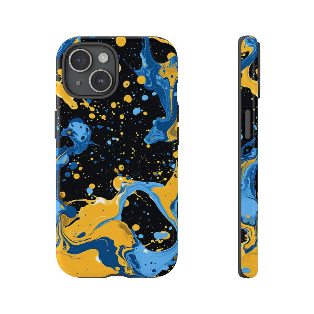 Dit hoesje heeft een opvallend ontwerp met dynamische spatten blauwe en gele verf op een diepzwarte achtergrond. De vloeiende, draaiende vormen en verspreide druppels zorgen voor een energieke en artistieke uitstraling. Het glanzende, stevige hoesje bestaat uit een dubbele laag: een polycarbonaat buitenkant en een TPU-binnenzijde. Dit biedt extra stevigheid en bescherming. Het hoesje ondersteunt draadloos opladen en behoudt langdurig zijn heldere uitstraling, zelfs bij intensief gebruik en blootstelling aan verschillende weersomstandigheden.
