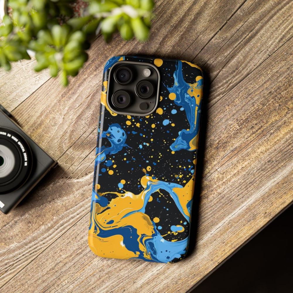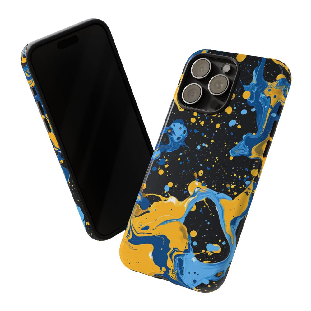 Dit hoesje heeft een opvallend ontwerp met dynamische spatten blauwe en gele verf op een diepzwarte achtergrond. De vloeiende, draaiende vormen en verspreide druppels zorgen voor een energieke en artistieke uitstraling. Het glanzende, stevige hoesje bestaat uit een dubbele laag: een polycarbonaat buitenkant en een TPU-binnenzijde. Dit biedt extra stevigheid en bescherming. Het hoesje ondersteunt draadloos opladen en behoudt langdurig zijn heldere uitstraling, zelfs bij intensief gebruik en blootstelling aan verschillende weersomstandigheden.