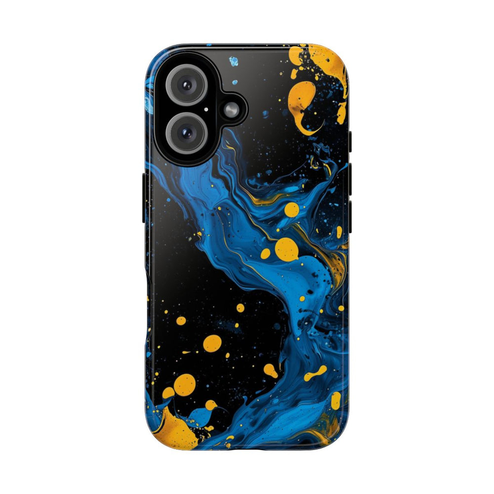 Dit ontwerp heeft opvallende blauwe en gele verfspatten en -wervelingen op een diepzwarte achtergrond. De blauwe verf vormt vloeiende, golvende patronen met verschillende tinten en structuren, terwijl de gele verf te zien is als krachtige, verspreide druppels en spetters. Het kleurcontrast zorgt voor een dynamische en energieke abstracte uitstraling. Dit glanzende, stevige hoesje is gemaakt van een polycarbonaat buitenkant met een TPU-binnenzijde en biedt dubbele bescherming. Geschikt voor draadloos opladen.