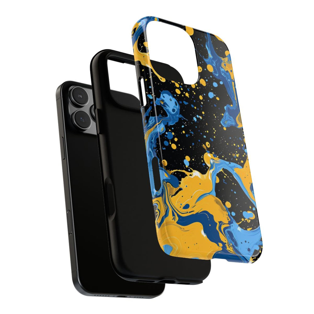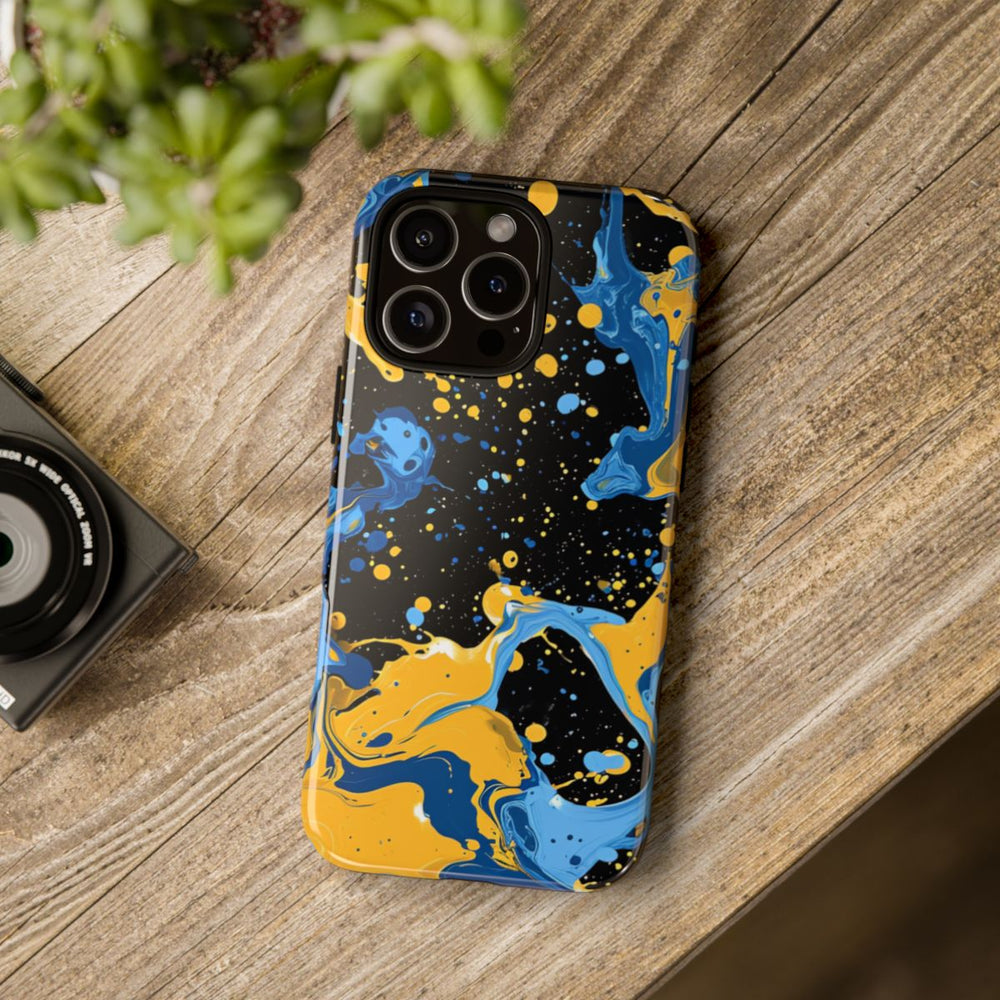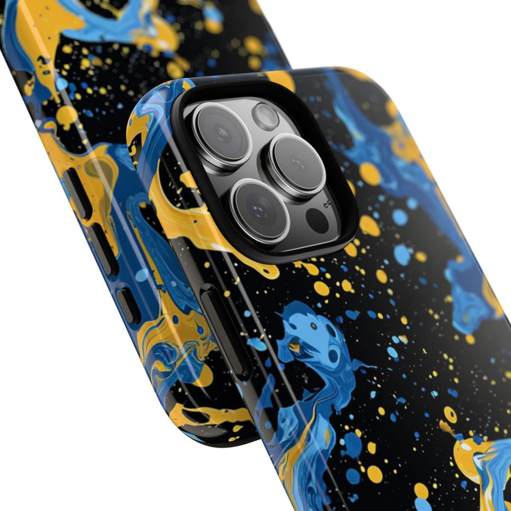 Dit hoesje heeft een opvallend ontwerp met dynamische spatten blauwe en gele verf op een diepzwarte achtergrond. De vloeiende, draaiende vormen en verspreide druppels zorgen voor een energieke en artistieke uitstraling. Het glanzende, stevige hoesje bestaat uit een dubbele laag: een polycarbonaat buitenkant en een TPU-binnenzijde. Dit biedt extra stevigheid en bescherming. Het hoesje ondersteunt draadloos opladen en behoudt langdurig zijn heldere uitstraling, zelfs bij intensief gebruik en blootstelling aan verschillende weersomstandigheden.