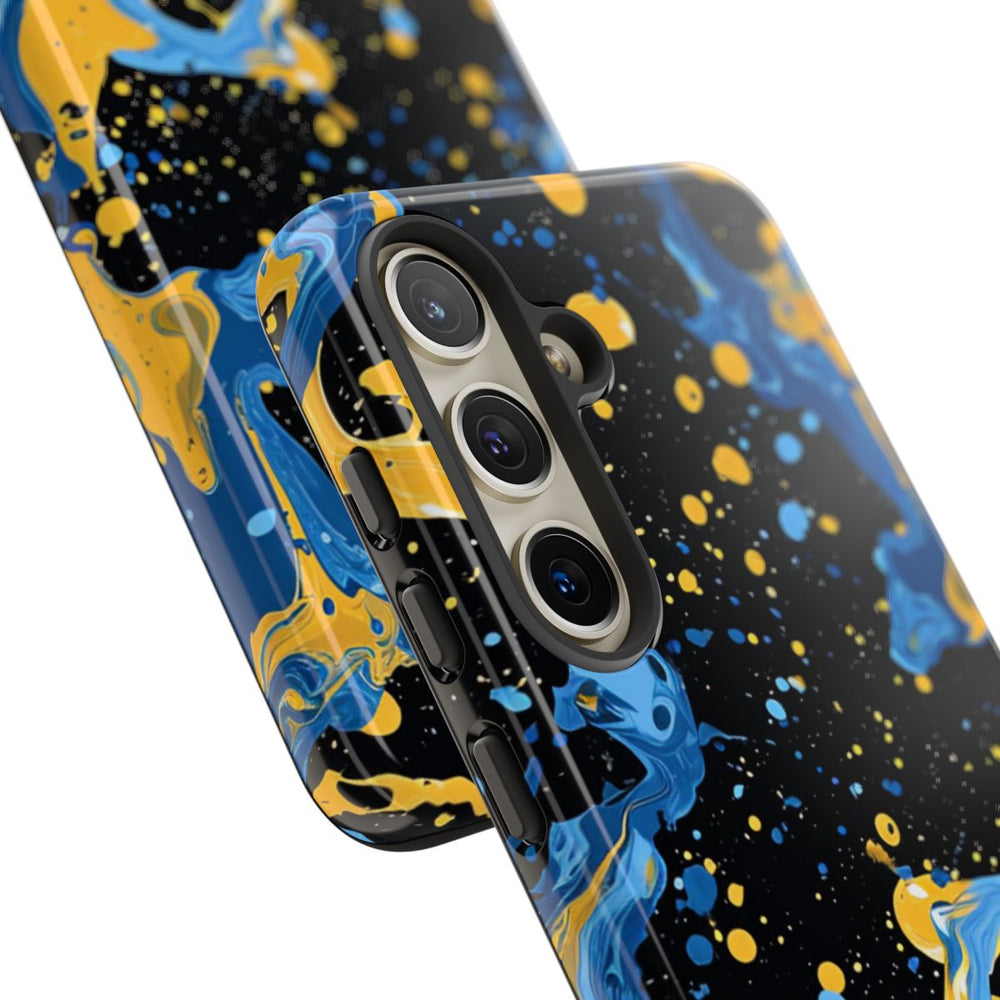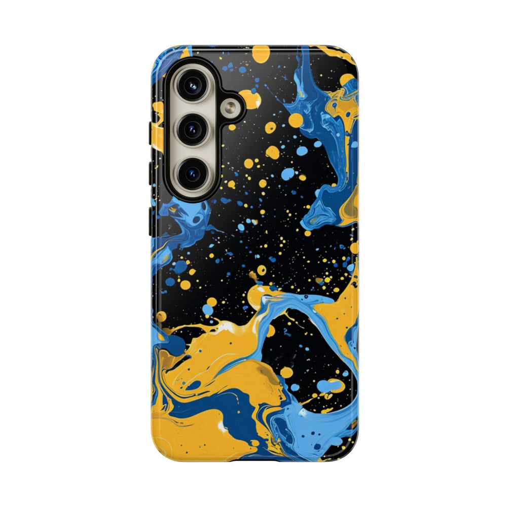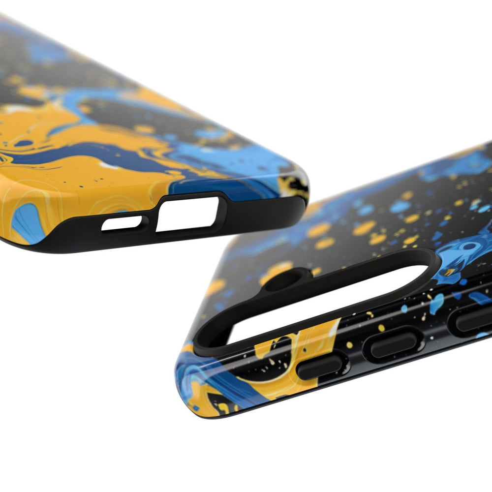 Dit hoesje heeft een opvallend ontwerp met dynamische spatten blauwe en gele verf op een diepzwarte achtergrond. De vloeiende, draaiende vormen en verspreide druppels zorgen voor een energieke en artistieke uitstraling. Het glanzende, stevige hoesje bestaat uit een dubbele laag: een polycarbonaat buitenkant en een TPU-binnenzijde. Dit biedt extra stevigheid en bescherming. Het hoesje ondersteunt draadloos opladen en behoudt langdurig zijn heldere uitstraling, zelfs bij intensief gebruik en blootstelling aan verschillende weersomstandigheden.