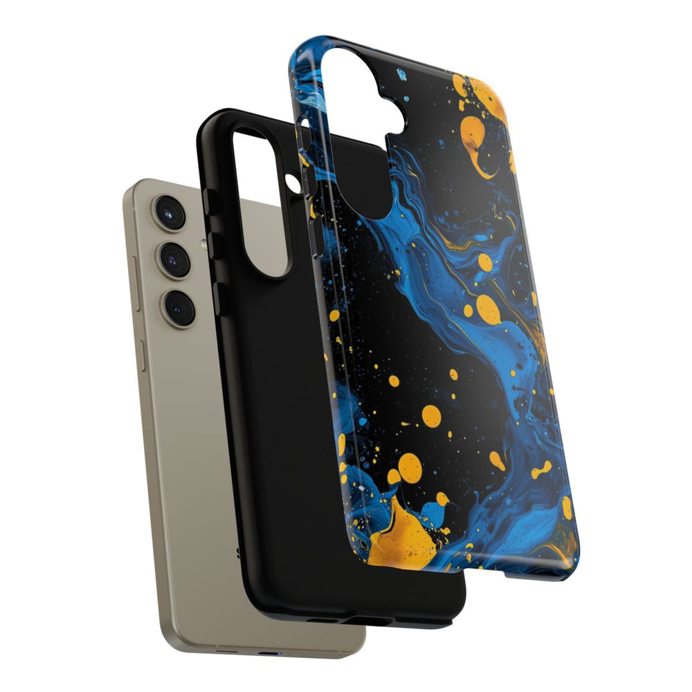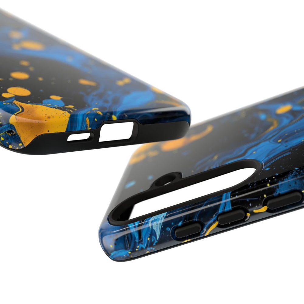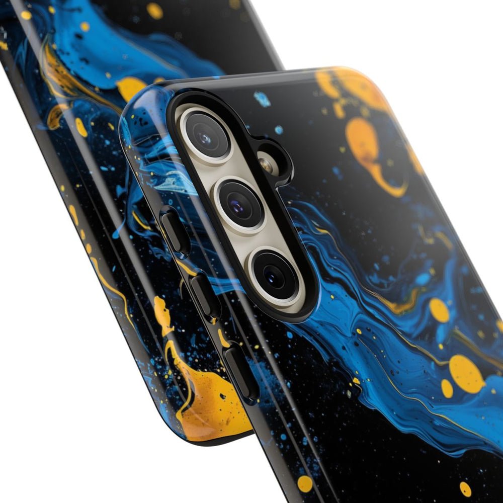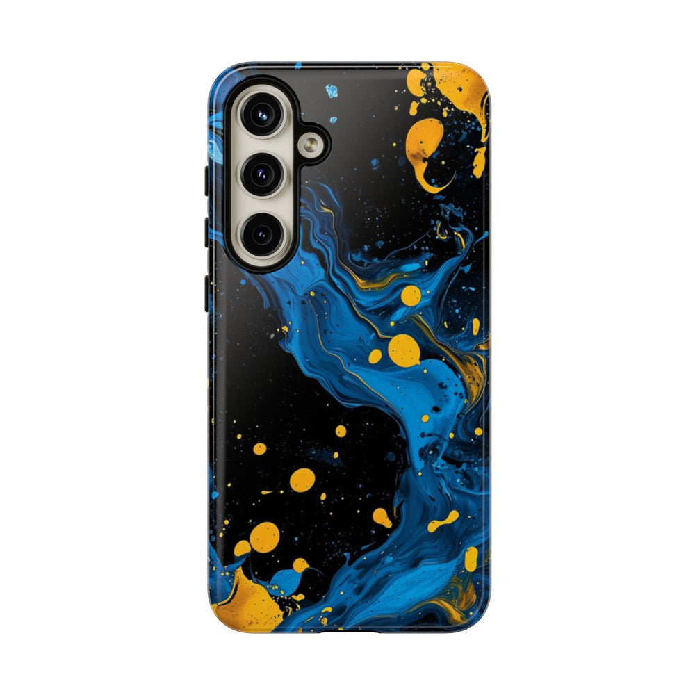 Dit ontwerp heeft opvallende blauwe en gele verfspatten en -wervelingen op een diepzwarte achtergrond. De blauwe verf vormt vloeiende, golvende patronen met verschillende tinten en structuren, terwijl de gele verf te zien is als krachtige, verspreide druppels en spetters. Het kleurcontrast zorgt voor een dynamische en energieke abstracte uitstraling. Dit glanzende, stevige hoesje is gemaakt van een polycarbonaat buitenkant met een TPU-binnenzijde en biedt dubbele bescherming. Geschikt voor draadloos opladen.