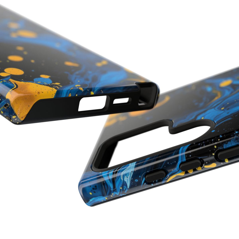 Dit ontwerp heeft opvallende blauwe en gele verfspatten en -wervelingen op een diepzwarte achtergrond. De blauwe verf vormt vloeiende, golvende patronen met verschillende tinten en structuren, terwijl de gele verf te zien is als krachtige, verspreide druppels en spetters. Het kleurcontrast zorgt voor een dynamische en energieke abstracte uitstraling. Dit glanzende, stevige hoesje is gemaakt van een polycarbonaat buitenkant met een TPU-binnenzijde en biedt dubbele bescherming. Geschikt voor draadloos opladen.