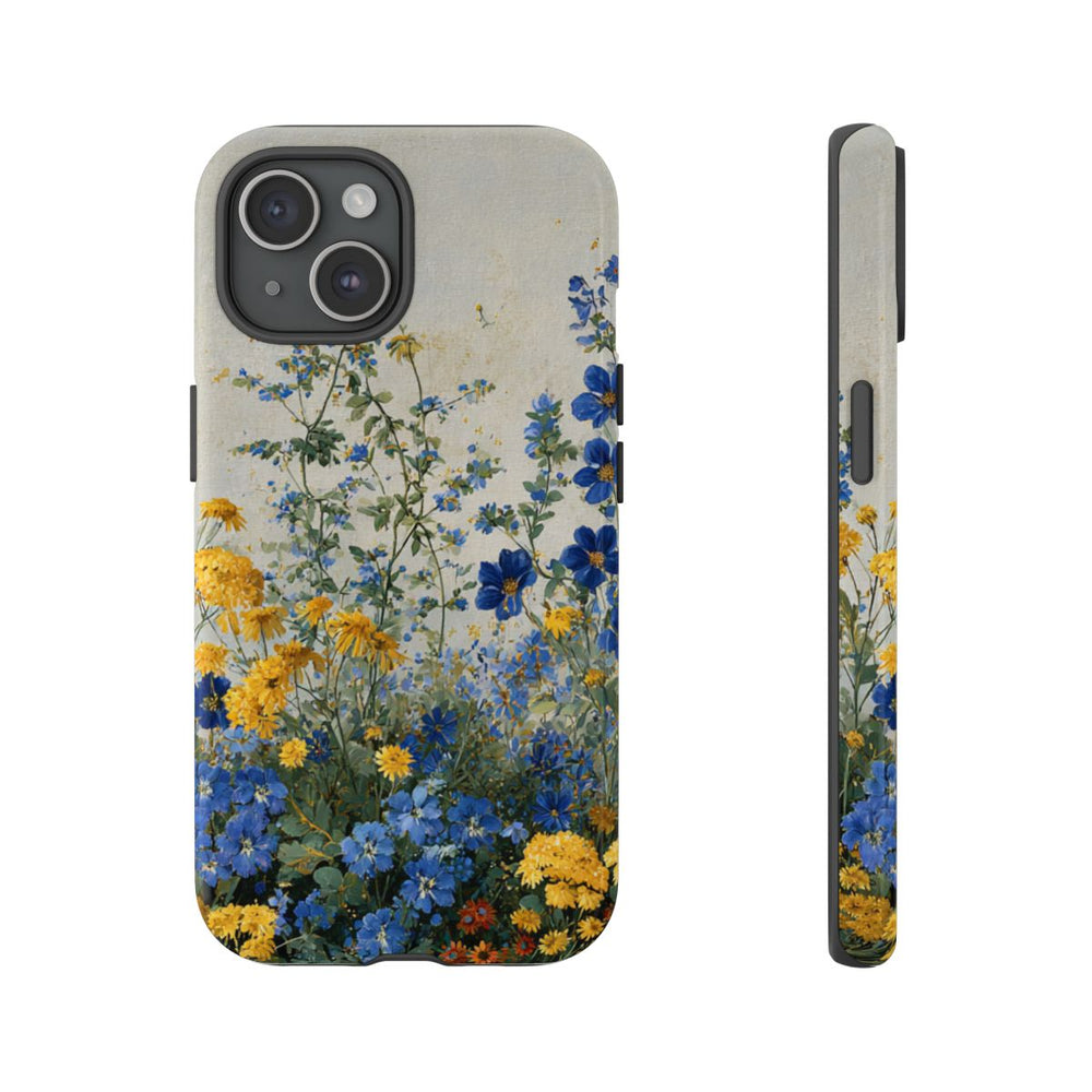 Dit hoesje is versierd met een weelderig patroon van wilde bloemen in levendige blauwe en gele tinten. De bloemen verschillen in vorm en grootte, waardoor een natuurlijke, speelse rand ontstaat tegen een lichte, subtiel getextureerde achtergrond. Het hoesje heeft een stevige dubbele laag: een harde polycarbonaat buitenkant en een TPU-binnenzijde voor extra bescherming. Geschikt voor draadloos opladen en bestand tegen invloeden van buitenaf, ideaal voor dagelijks gebruik.