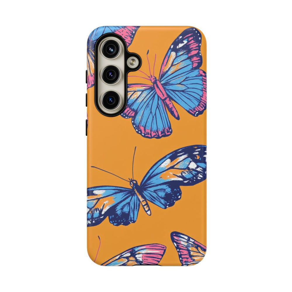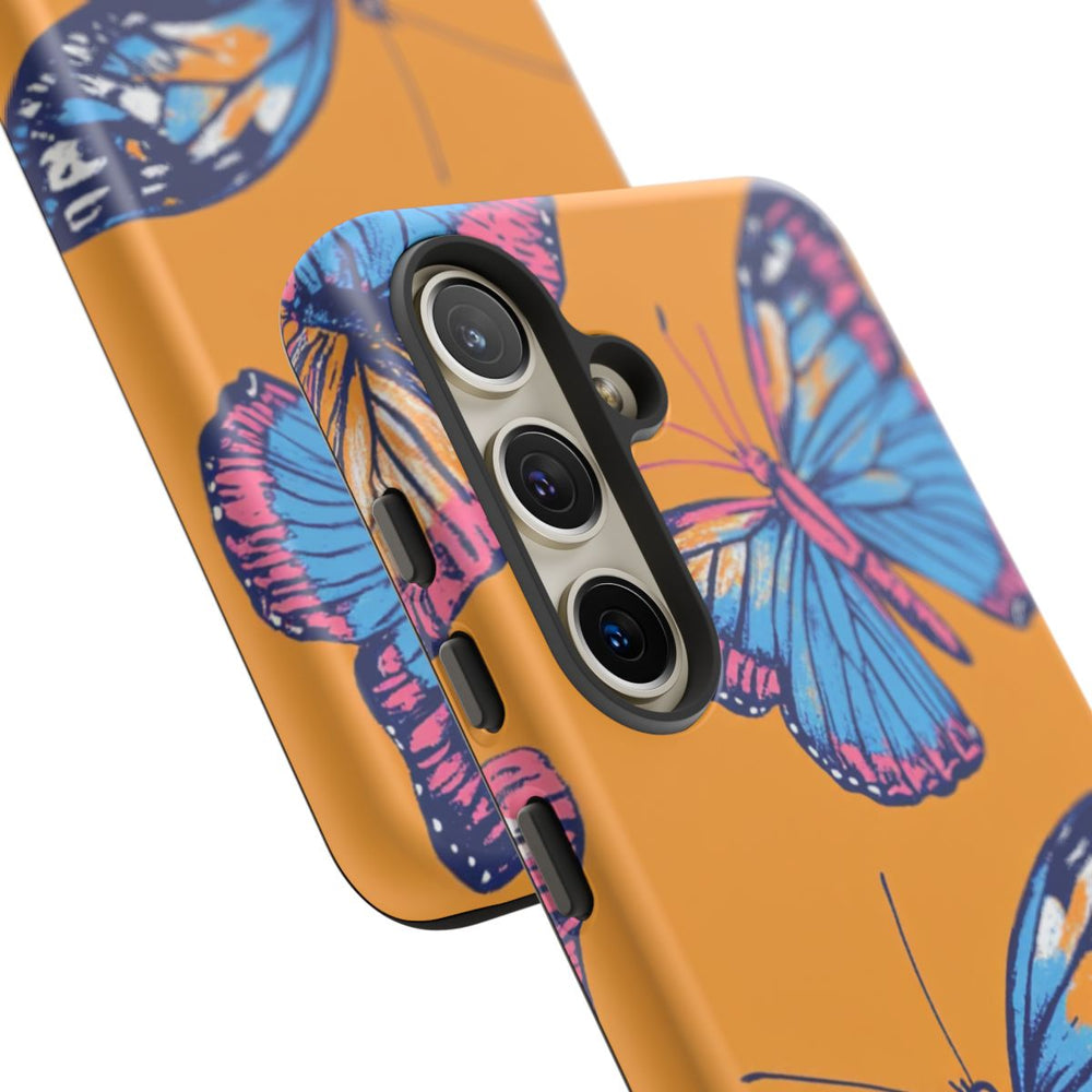 Dit hoesje heeft een doorlopend patroon van vlinders met blauwe en roze vleugels, afgewerkt met oranje en witte accenten. De vlinders zijn getekend in een blokdrukstijl, met verfijnde lijnen en heldere kleuren. De achtergrond is effen feloranje, wat zorgt voor een opvallend contrast met de vlinders. Het patroon is gedrukt op een mat hoesje van polycarbonaat en TPU, dat bestaat uit twee lagen voor extra bescherming en geschikt is voor draadloos opladen.