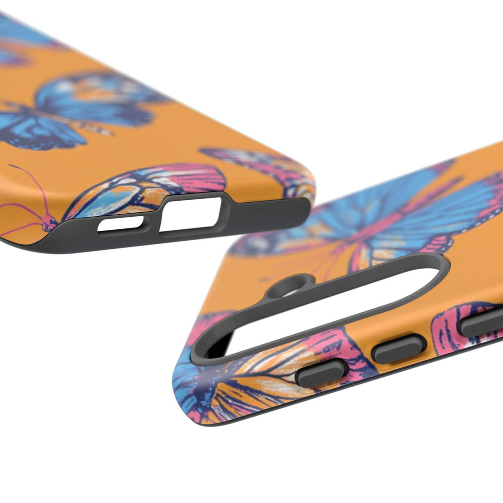 Dit hoesje heeft een doorlopend patroon van vlinders met blauwe en roze vleugels, afgewerkt met oranje en witte accenten. De vlinders zijn getekend in een blokdrukstijl, met verfijnde lijnen en heldere kleuren. De achtergrond is effen feloranje, wat zorgt voor een opvallend contrast met de vlinders. Het patroon is gedrukt op een mat hoesje van polycarbonaat en TPU, dat bestaat uit twee lagen voor extra bescherming en geschikt is voor draadloos opladen.
