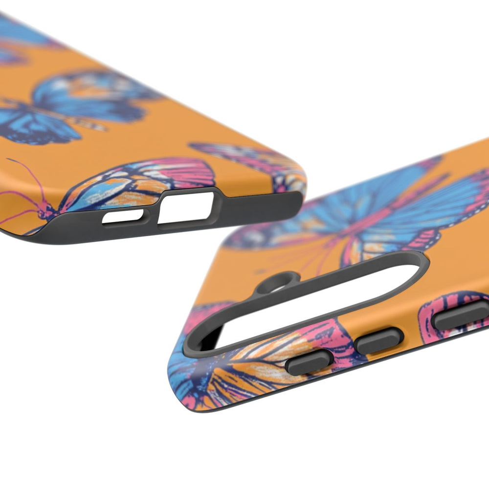 Dit hoesje heeft een doorlopend patroon van vlinders met blauwe en roze vleugels, afgewerkt met oranje en witte accenten. De vlinders zijn getekend in een blokdrukstijl, met verfijnde lijnen en heldere kleuren. De achtergrond is effen feloranje, wat zorgt voor een opvallend contrast met de vlinders. Het patroon is gedrukt op een mat hoesje van polycarbonaat en TPU, dat bestaat uit twee lagen voor extra bescherming en geschikt is voor draadloos opladen.