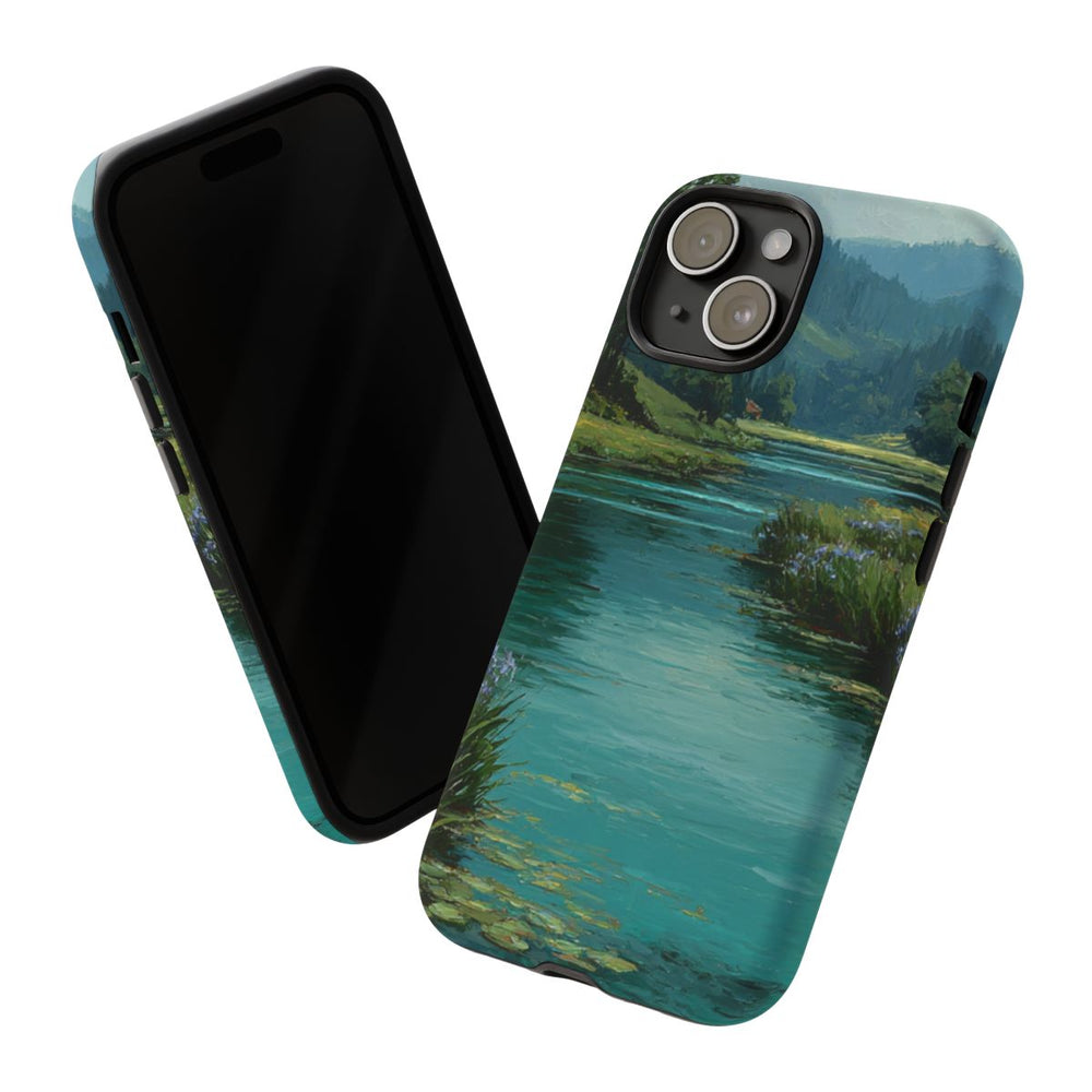 Dit telefoonhoesje toont een rustgevende rivier die door een weelderig groen landschap stroomt. Langs de oevers bloeien blauwe irissen, die het geheel een levendige kleur geven. Het heldere water weerspiegelt het omliggende groen en de heuvels in de verte. De deels bewolkte lucht zorgt voor een vredige sfeer. De afbeelding is gedrukt op een mat, stevig hoesje van polycarbonaat en TPU, dat bescherming biedt en geschikt is voor draadloos opladen.