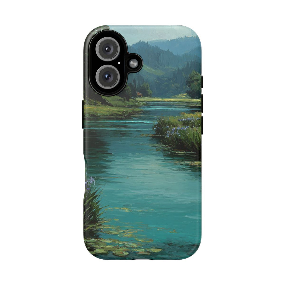 Dit hoesje toont een rustgevende rivier die door een weelderige groene vallei stroomt. Langs de oevers bloeien groepjes blauwe irissen. Het heldere water is bezaaid met drijvende waterlelies. Rondom de rivier liggen grasvelden en dichte bomen, met heuvels en bergen op de achtergrond onder een deels bewolkte lucht. Het ontwerp is gedrukt op een stevige, matte telefoonhoes met dubbele laag en is geschikt voor draadloos opladen.