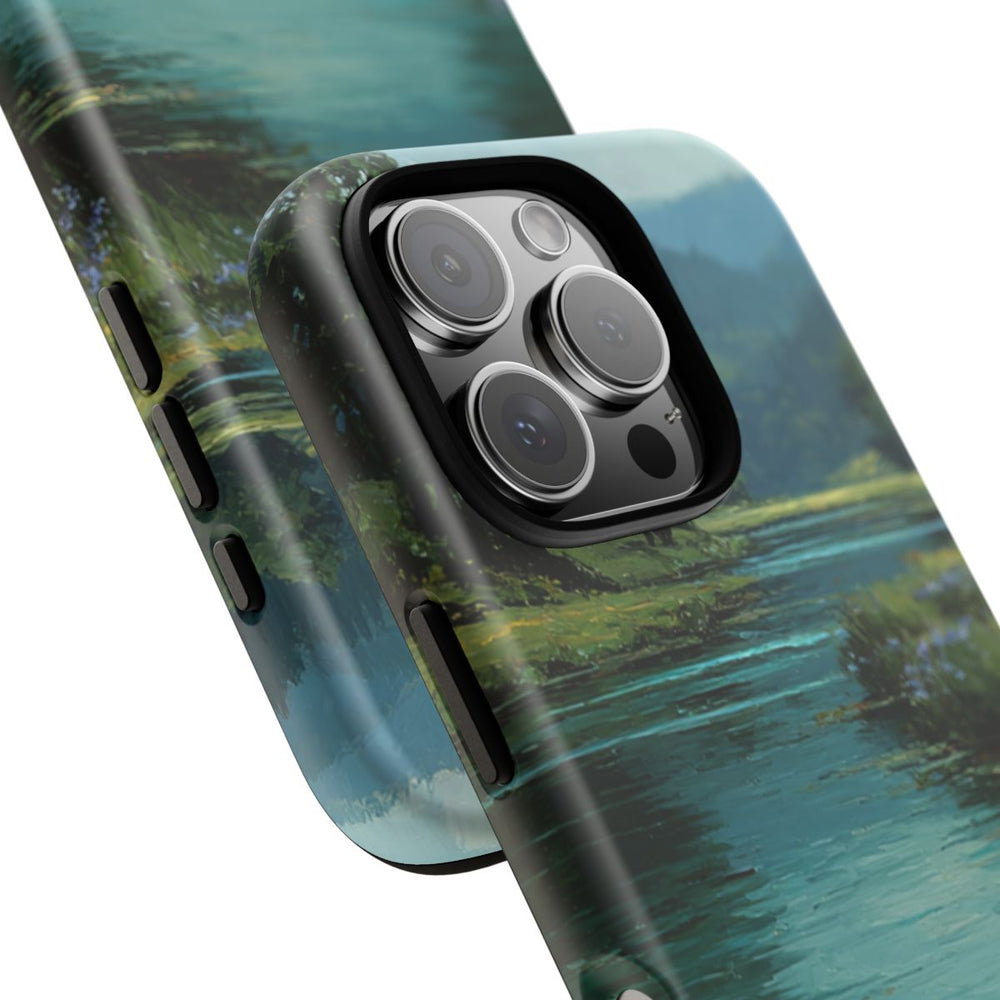 Dit telefoonhoesje toont een rustige rivier die door een weelderig groen landschap stroomt. Langs de oevers bloeien blauwe irissen, die het geheel een levendige uitstraling geven. Bomen en heuvels omringen het water en zorgen voor een vredige, natuurlijke sfeer onder een deels bewolkte lucht. Het hoesje heeft een dubbele laag van polycarbonaat en TPU voor optimale bescherming en duurzaamheid, en is geschikt voor draadloos opladen.