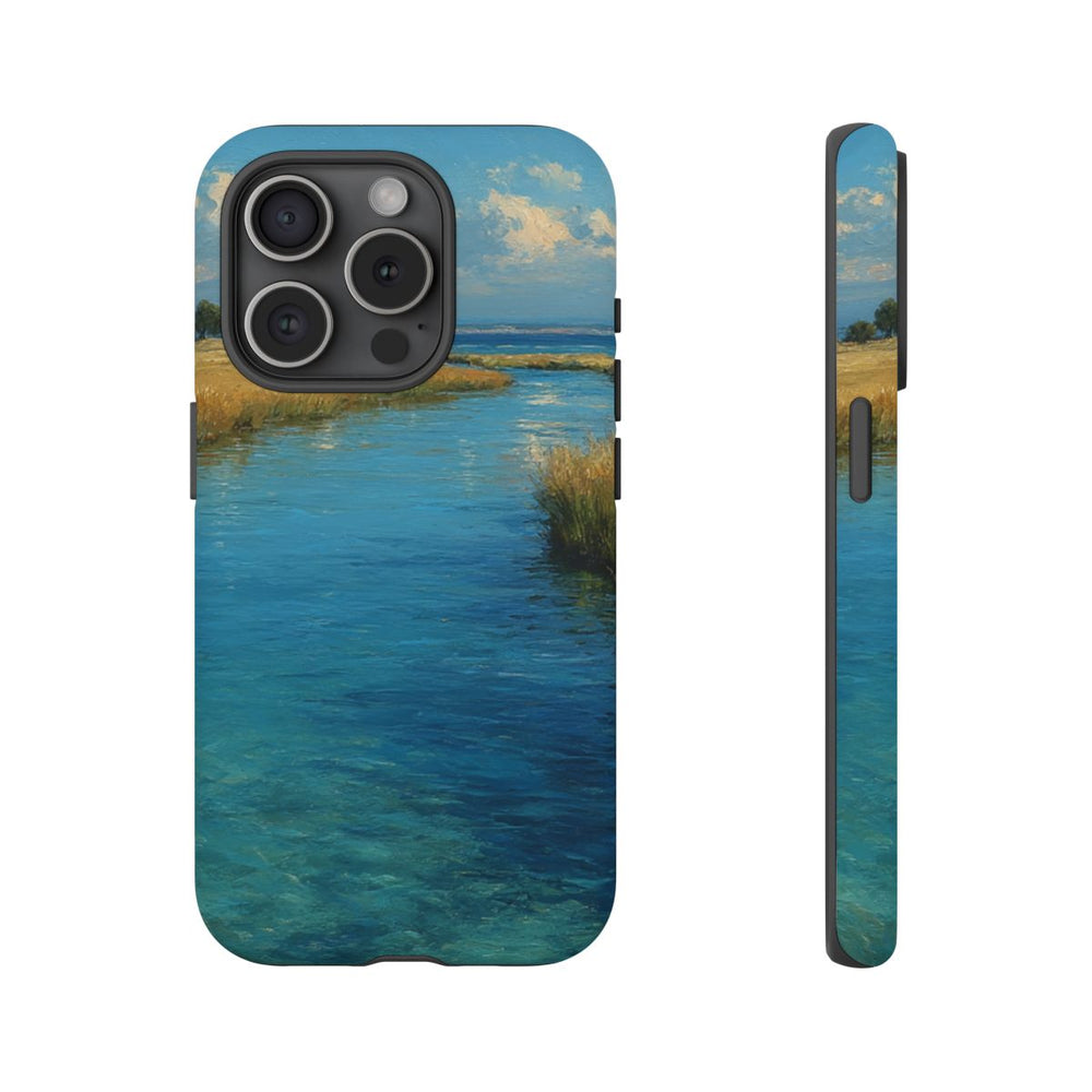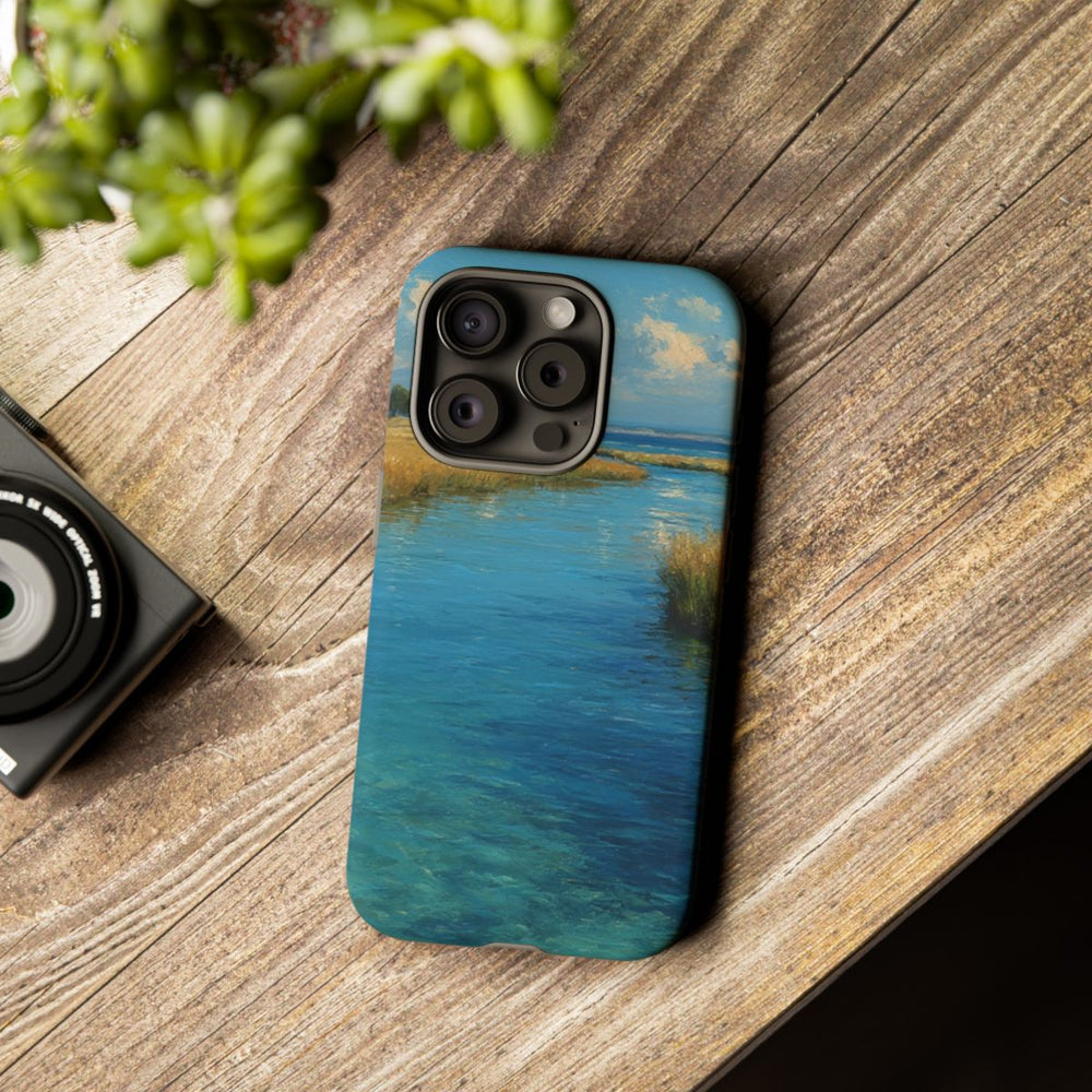Dit telefoonhoesje toont een sereen landschap met een heldere blauwe lagune die door hoge, goudkleurige grasvelden stroomt. De lucht is licht en bezaaid met witte wolken. In de verte zijn enkele bomen en een klein huis of gebouw bij de horizon te zien. De afbeelding is geschilderd met zachte belichting en natuurlijke kleuren, wat zorgt voor een rustige en sfeervolle uitstraling. Het hoesje heeft een dubbele laag met een matte afwerking en is gemaakt van polycarbonaat en TPU. Ondersteunt draadloos opladen.