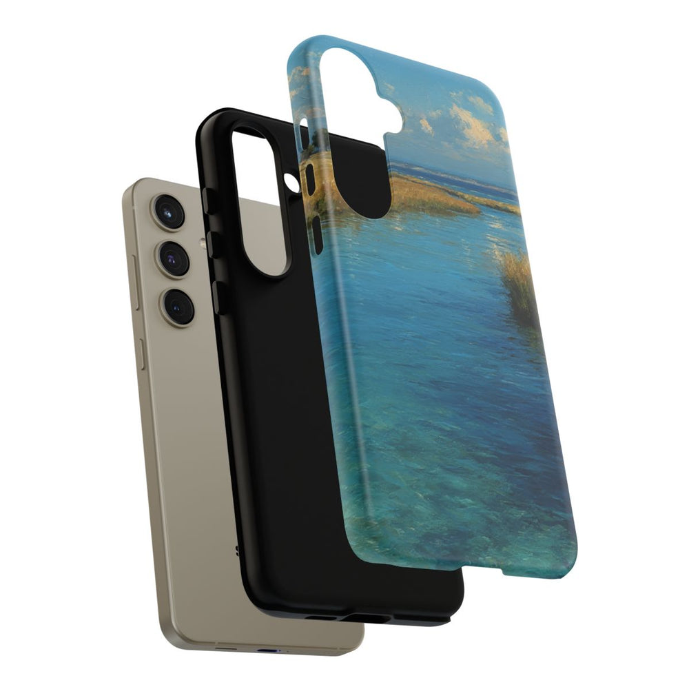 Dit telefoonhoesje toont een rustgevend landschap met een heldere blauwe lagune die door hoge, goudkleurige grasvelden stroomt. Op de achtergrond zijn enkele bomen en een klein huisje te zien onder een stralend blauwe lucht met witte wolken. De afbeelding straalt een vredige, natuurlijke sfeer uit met levendige kleuren en zachte belichting. Het matte hoesje is gemaakt van polycarbonaat en TPU voor extra stevigheid en ondersteunt draadloos opladen.