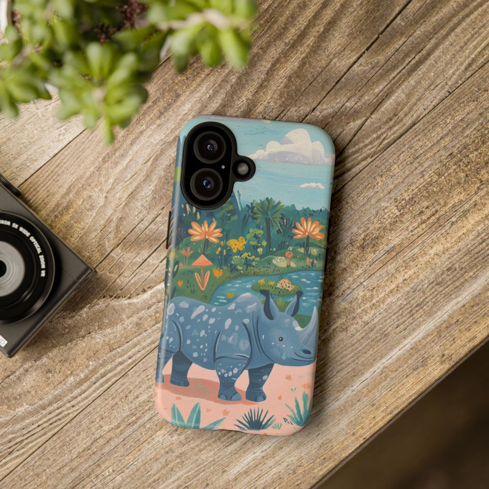 Dit hoesje heeft een illustratie van een blauwe neushoorn die op een lichtroze pad staat, omringd door weelderig groen en kleurrijke bloemen. Op de achtergrond zijn een kleine vijver, diverse planten en in de verte bergen te zien onder een lucht met witte wolken. De afbeelding gebruikt een rustige kleurencombinatie met accenten van oranje en geel, wat zorgt voor een vredige en speelse natuursfeer. Het hoesje bestaat uit twee lagen met een matte afwerking: een stevige polycarbonaat buitenkant en een TPU-binnenzijde. Ondersteunt draadloos opladen.