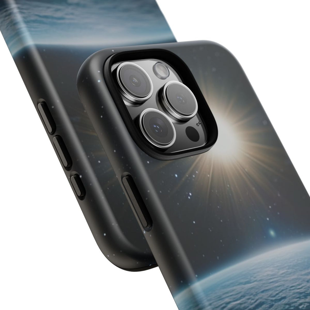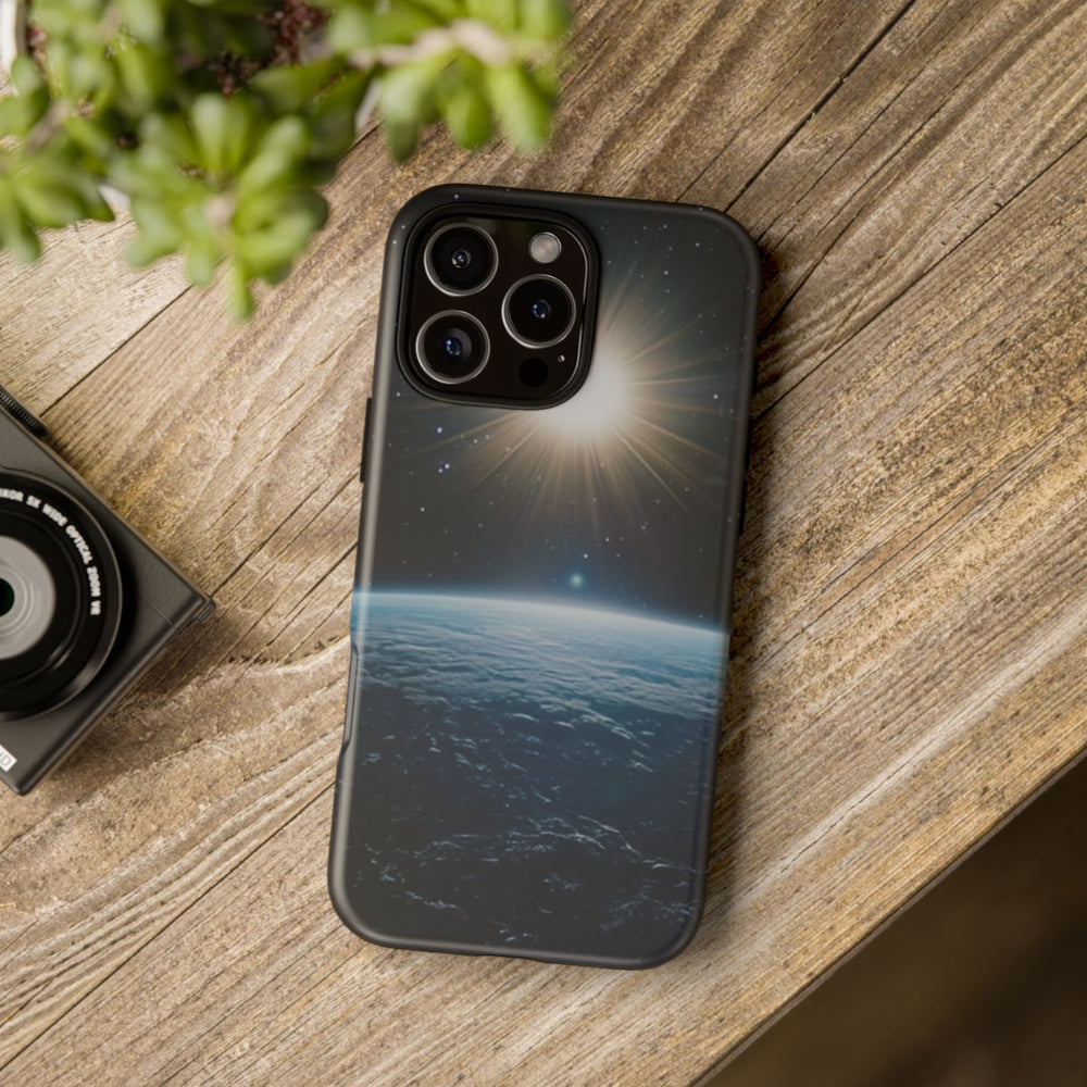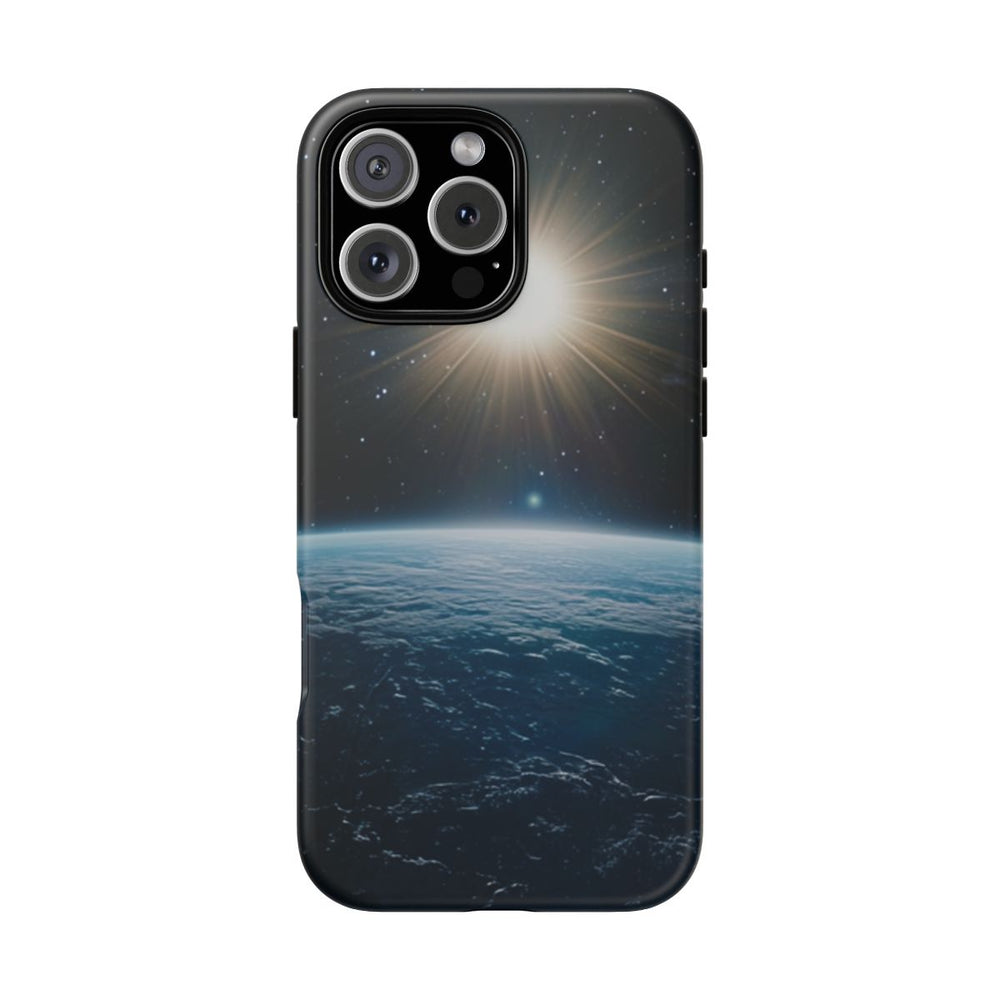 Dit ontwerp toont het uitzicht op de horizon van een blauwe planeet vanuit de ruimte, met daarboven een heldere, stralende zon. Op de achtergrond zijn talloze kleine sterren verspreid over het zwarte heelal. Het oppervlak van de planeet heeft een lichte textuur met schitterende reflecties, zonder zichtbare landmassa’s. Dit matte, stevige hoesje bestaat uit twee lagen van polycarbonaat en TPU, ondersteunt draadloos opladen en is ontworpen voor extra duurzaamheid en bescherming buitenshuis.