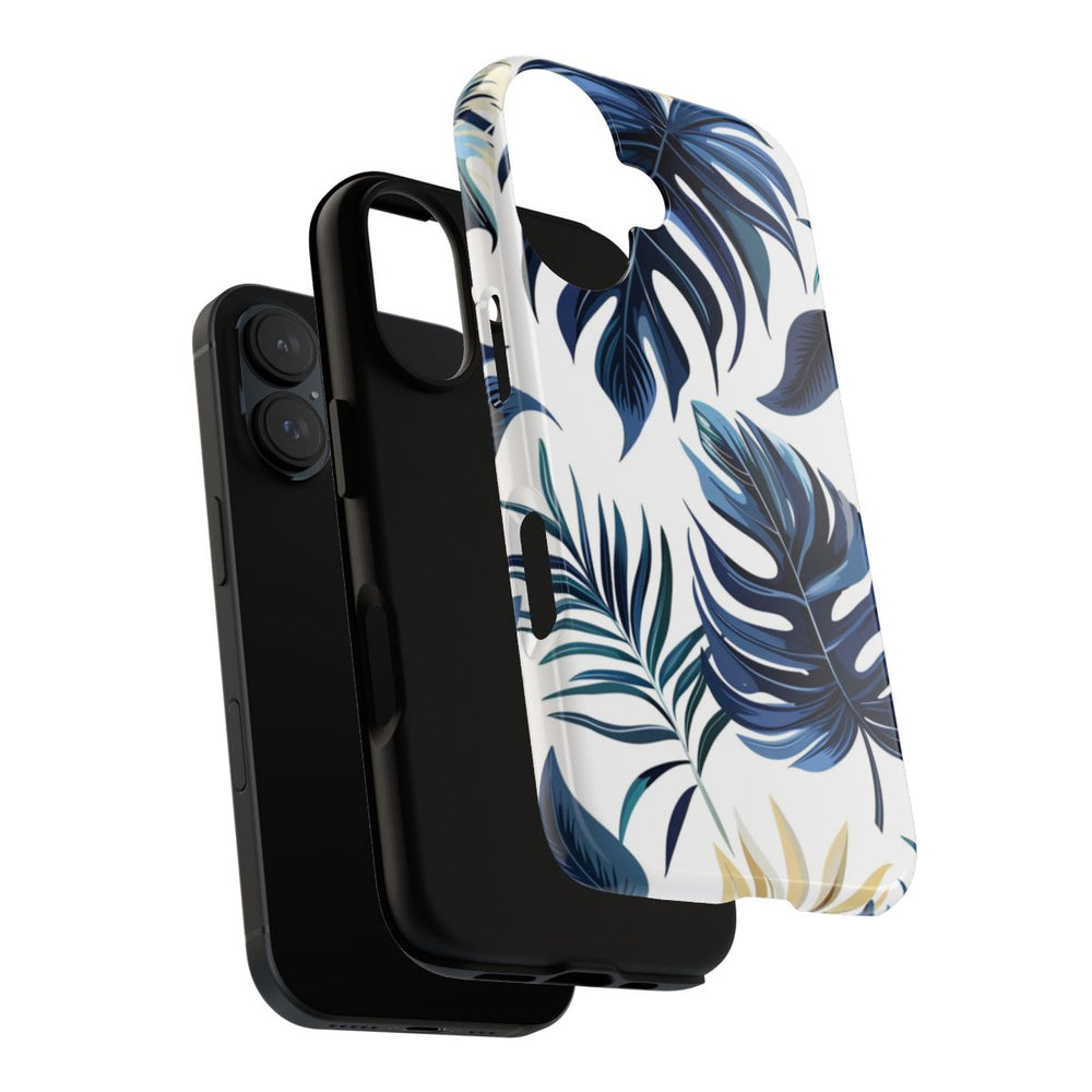 Dit telefoonhoesje heeft een patroon van tropische bladeren in verschillende tinten blauw, teal en beige op een witte achtergrond. De bladeren zijn gestileerd met verfijnde schaduwen en lichte accenten, wat zorgt voor een levendige en dynamische uitstraling. Het patroon is gelijkmatig verdeeld, waardoor het hoesje een frisse en natuurlijke sfeer krijgt. Dit glanzende, stevige hoesje bestaat uit twee lagen polycarbonaat en TPU voor extra stevigheid en bescherming. Ondersteunt draadloos opladen.