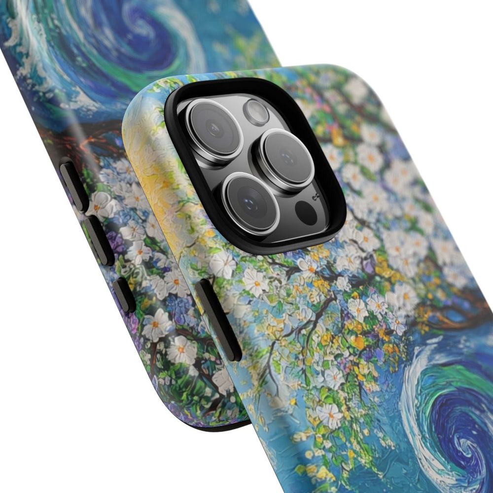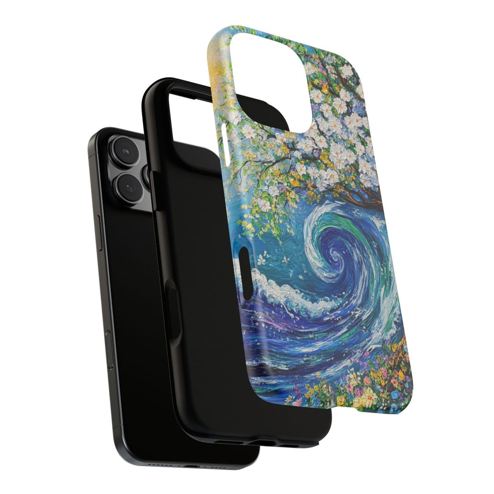 Dit telefoonhoesje heeft een levendige schildering van een grote oceaangolf naast een bloeiende boom vol witte, paarse en gele bloemen. Op de achtergrond zie je een heldere blauwe lucht met een stralende gele zon. Rondom de boom en golf zijn veel kleurrijke bloemen en groene bladeren te zien, wat zorgt voor een frisse en dynamische lentesfeer. Het hoesje bestaat uit twee lagen van polycarbonaat en TPU en ondersteunt draadloos opladen.