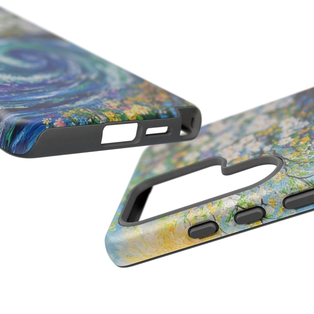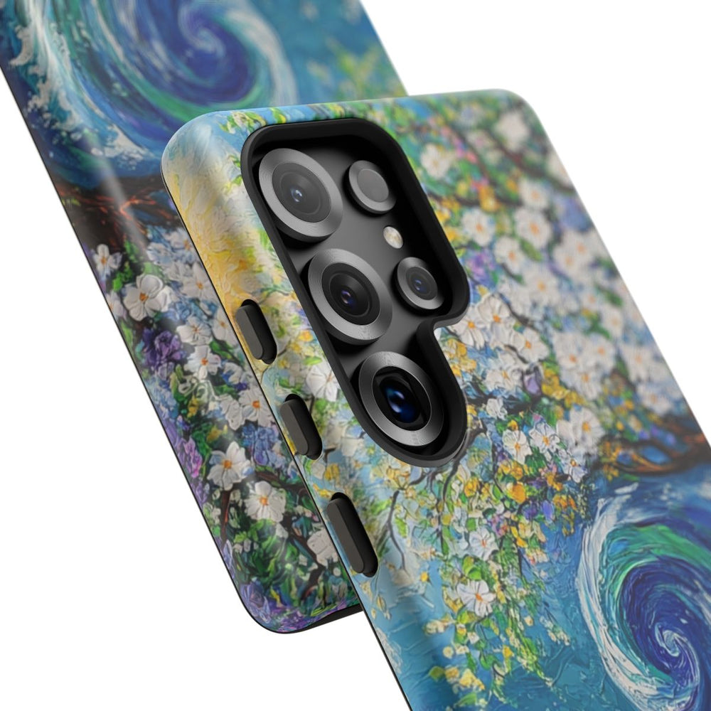 Dit telefoonhoesje is voorzien van een levendige schildering met een grote oceaangolf die zich naast een bloeiende boom met witte en paarse bloemen krult. Op de achtergrond straalt een heldere gele zon aan een blauwe lucht. Op de voorgrond zijn kleurrijke bloemen te zien in verschillende tinten, waaronder geel, roze en blauw. Het hoesje bestaat uit twee lagen: een stevige polycarbonaat buitenkant en een TPU binnenzijde. Het ondersteunt draadloos opladen en is bestand tegen diverse weersomstandigheden.