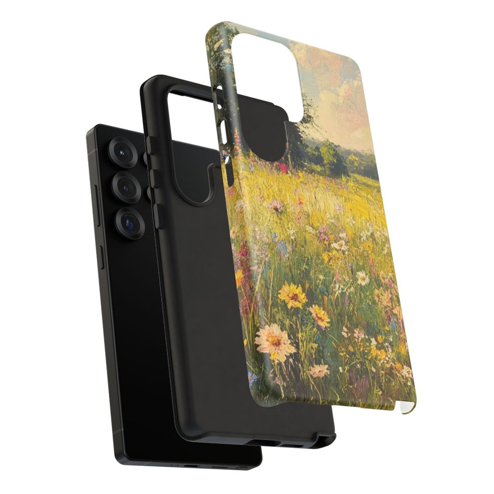 Dit telefoonhoesje toont een levendige bloemenweide vol kleurrijke bloemen in geel, roze, wit en blauw. Het veld strekt zich uit tot aan de rand, waar hoge groene bomen de weide omzomen onder een deels bewolkte blauwe lucht. De afbeelding is uitgevoerd in een impressionistische stijl met zichtbare penseelstreken. Het stevige, matte hoesje bestaat uit twee lagen van polycarbonaat en TPU en biedt optimale bescherming én ondersteuning voor draadloos opladen.
