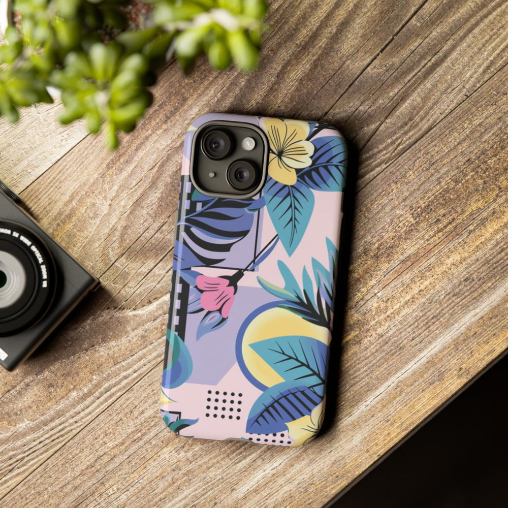 Dit hoesje heeft een levendig bloemenpatroon met gele en roze bloemen, aangevuld met blauwe en groenblauwe bladeren. De achtergrond bestaat uit geometrische vormen zoals cirkels, rechthoeken en stippen in tinten paars, zwart en lichtroze. De combinatie van bloemen en geometrische elementen zorgt voor een moderne en artistieke uitstraling. Het patroon is bedrukt op een glanzend, stevig hoesje van polycarbonaat en TPU, dat optimale bescherming biedt en draadloos opladen ondersteunt.