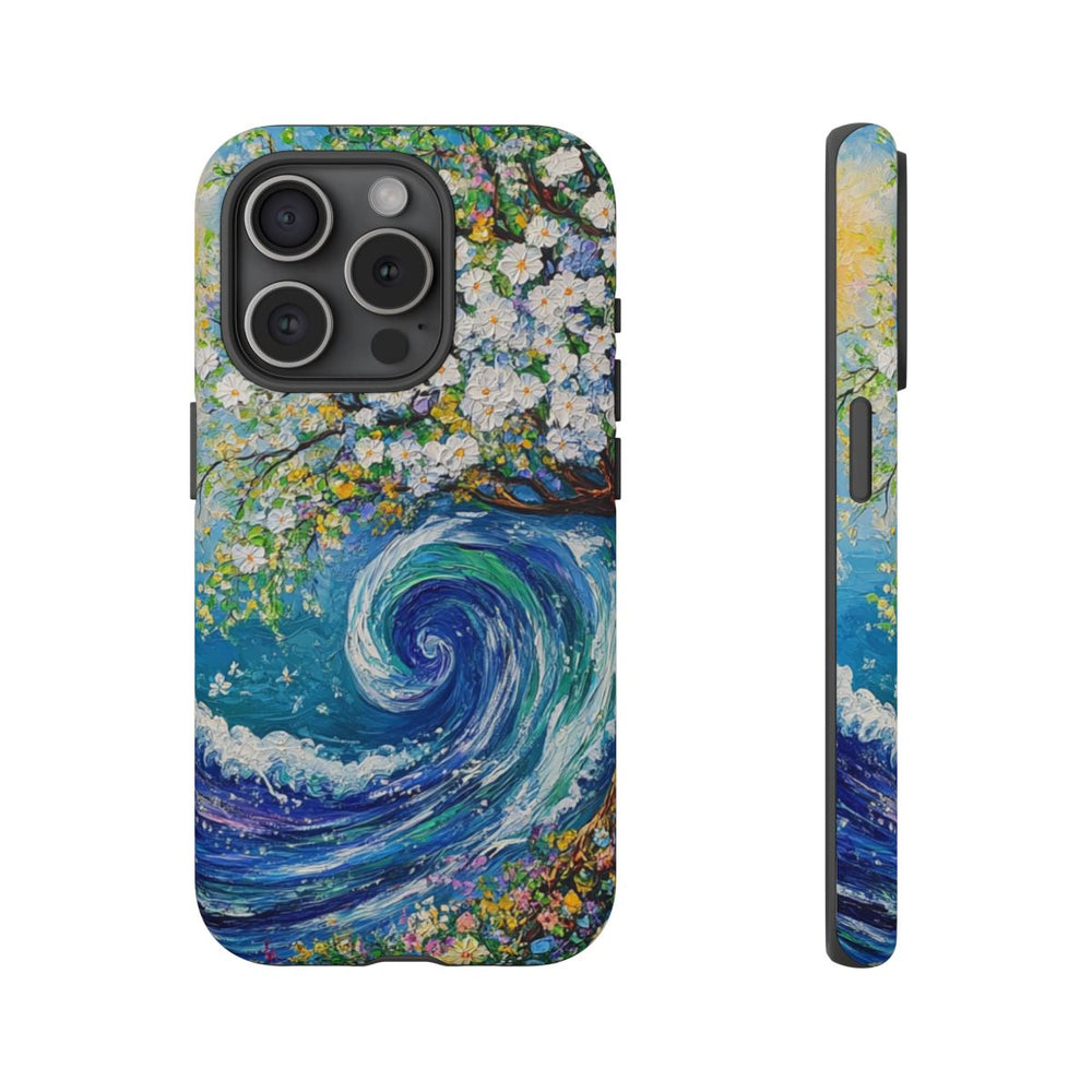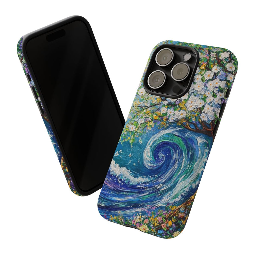 Dit hoesje is voorzien van een levendige schildering met een grote, draaiende oceaangolf in blauw- en groentinten. Rechts steekt een boom met witte en paarse bloesem zijn takken uit over de golf. Op de voorgrond bloeien kleurrijke bloemen in geel, roze, blauw en paars. Een heldere gele zon straalt aan de blauwe lucht en verlicht het vrolijke lentetafereel. Het stevige, matte hoesje bestaat uit twee lagen van polycarbonaat en TPU en is geschikt voor draadloos opladen.