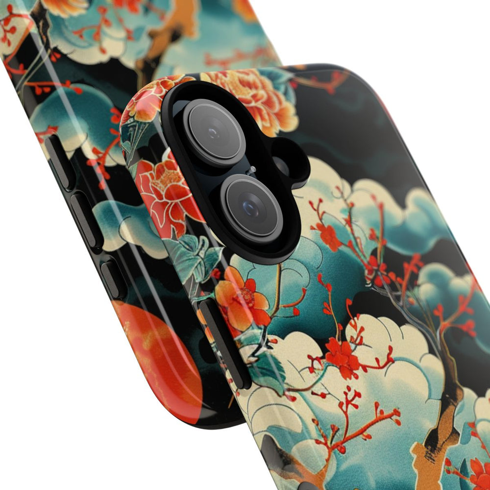 Dit ontwerp toont een gestileerde tak met oranje en rode bloemen, tegen een sfeervolle achtergrond van draaiende wolken en een grote oranje maan. De bloemen zijn rijk gedetailleerd met groene bladeren, terwijl de wolken in zachte crème- en groentinten zijn weergegeven. De donkere achtergrond laat de levendige bloemen extra opvallen. De afbeelding is gedrukt op een glanzend, stevig hoesje van polycarbonaat en TPU, dat dubbele bescherming biedt en geschikt is voor draadloos opladen.